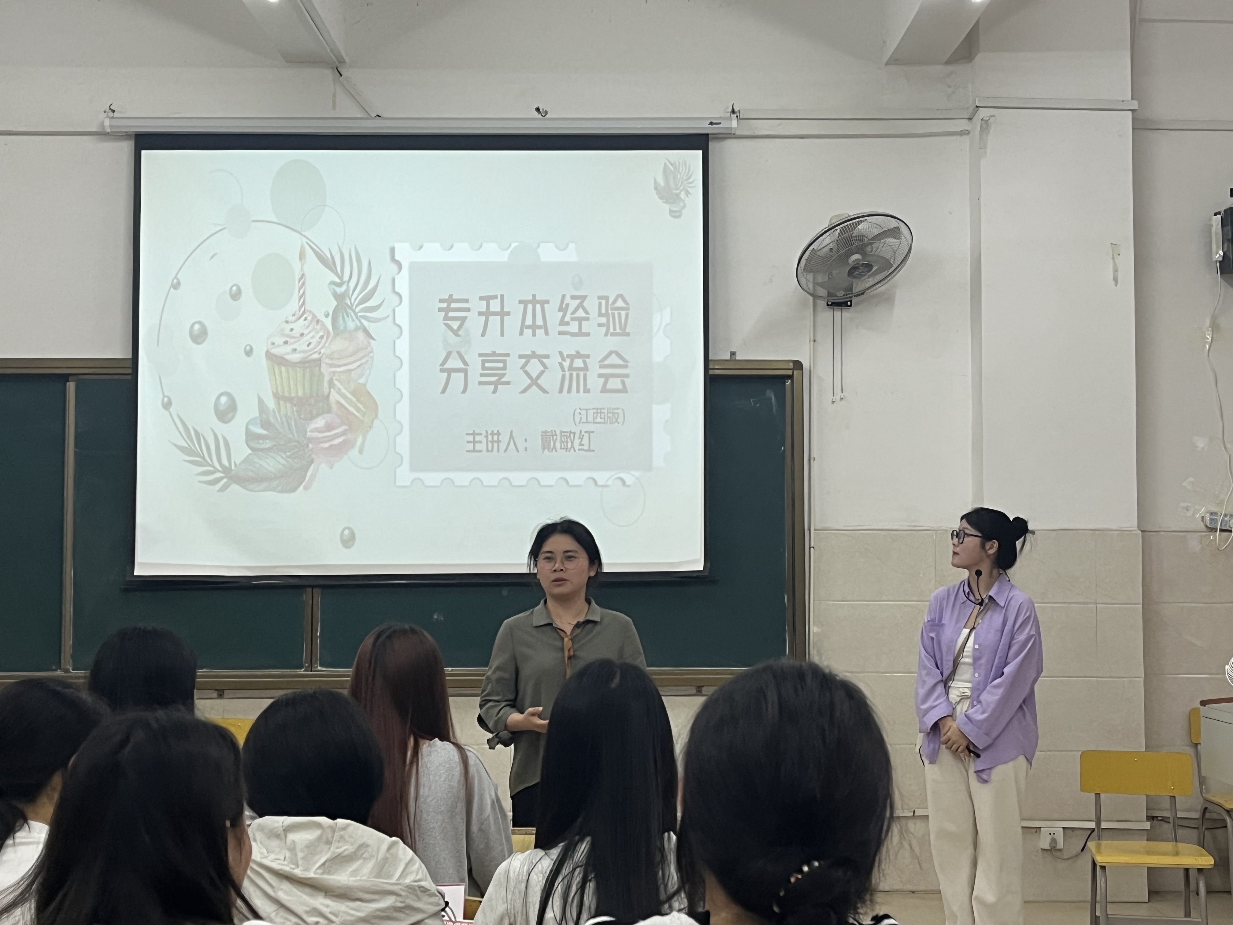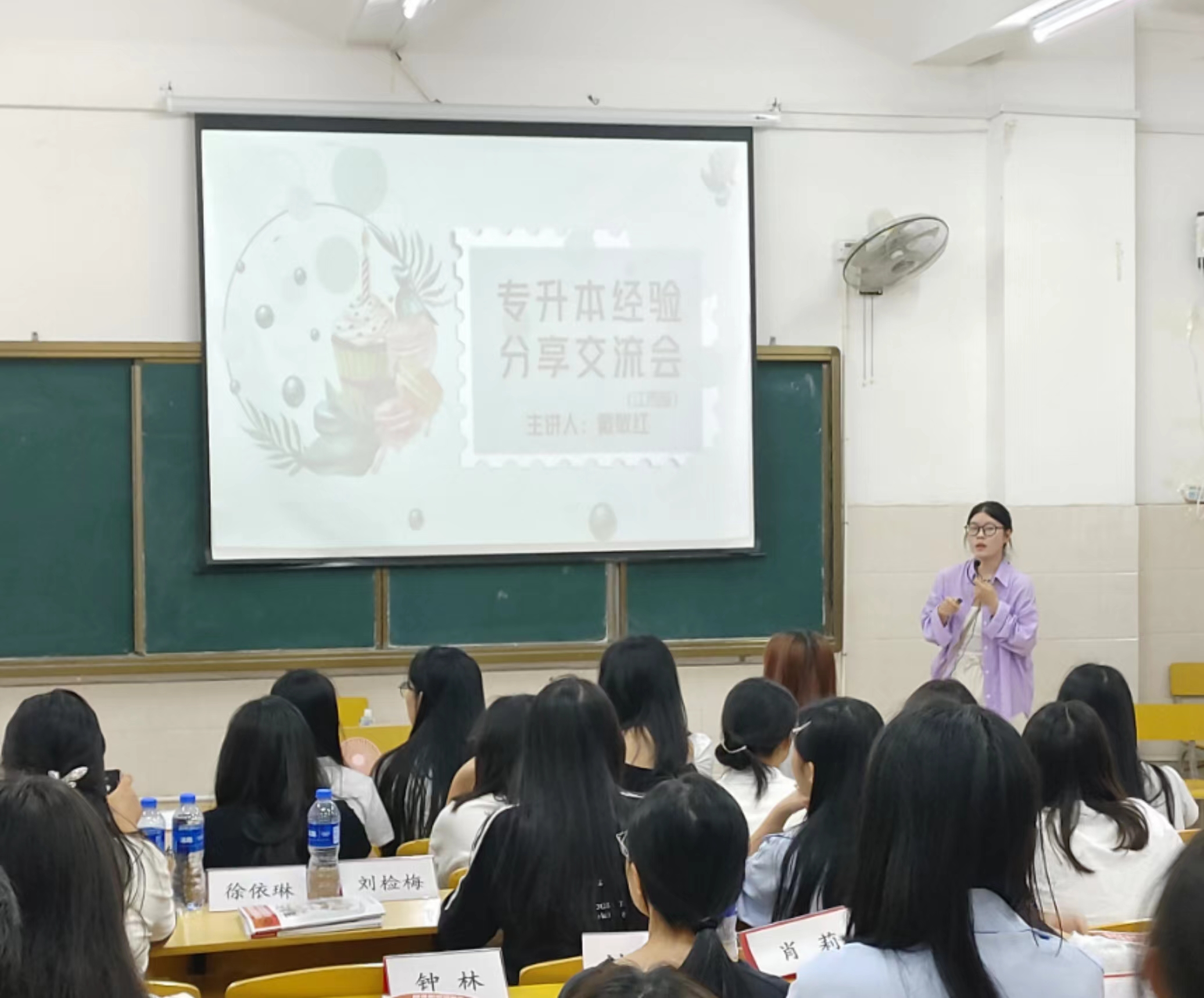 分享会上,戴敏红结合自己的备考经历,从护理专业未来的发展趋势、江西专升本相关政策、备考的途径、备考的建议以及个人升本经历五个方面分享了自己的经验并与同学们互相交流,悉心为同学们答疑解惑。她希望大家认真学好专业课程,在日常学习中培养良好的学习习惯,鼓励有专升本意向的同学保持积极心态、掌握科学的学习方法、锻炼强健的体魄、坚持不懈,争取考上自己心仪的学校。