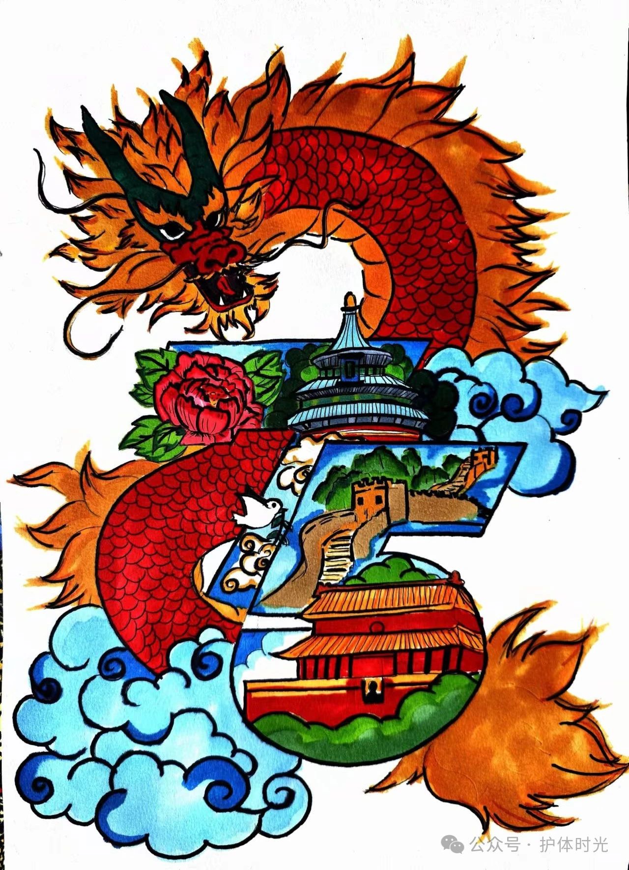 一幅幅绚丽多彩的作品,满溢着护理学子们对祖国的热爱与赞美。护理学子们围绕“热爱祖国”“我的祖国”“中华人民共和国成立 75 周年”等主题倾心创作,用饱含深情的画笔为祖国母亲呈上这份特别的生日礼物。每一抹色彩、每一道线条,都凝聚着护理学子们对祖国的热爱与敬仰。
