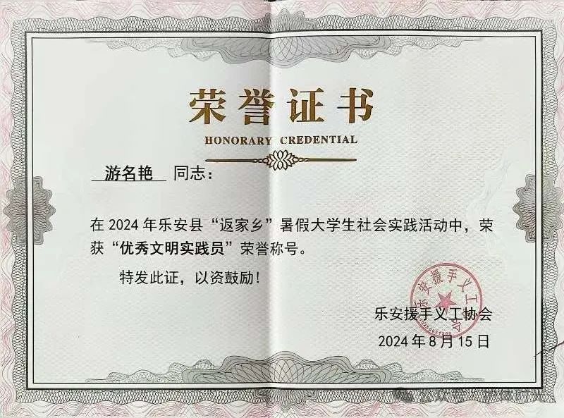 在暑期,我参加了<桑梓计划>。我们在乐安e中心通过开展防溺水教育工作日活动,普及救援知识,提高公众的防溺水安全意识和自救互救能力,减少溺水事故的发生。邀请红十字会专业的救援人员进行防溺水知识宣讲由救援人员现场演示溺水后的救援方法,如心肺复苏、人工呼吸等。同时,讲解救援过程中的注意事项,。设置防溺水知识有奖竞猜环节;在援手义工协会开展暑期支教活动为孩子们送去教育与陪伴,开张书法、非洲鼓、绘画、托教班等课程。让孩子能够寓教于乐,促进孩子们的综合素质发展,同时也锻炼支教大学生学以致用的能力;下乡走访重度失能残疾人,用爱与责任点亮希望之光。为他们送去更多爱与包容,同时他们的坚韧和坚强,也让我明白生命的价值不只在于健全,而是内心的强大;帮助弃婴寻母的这段道路,也让我明白了她对亲人的向往,和对心里所向往的那份归属感的渴望,我衷心希望早日与亲生父母重逢,解开心中的结。