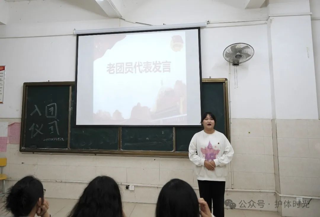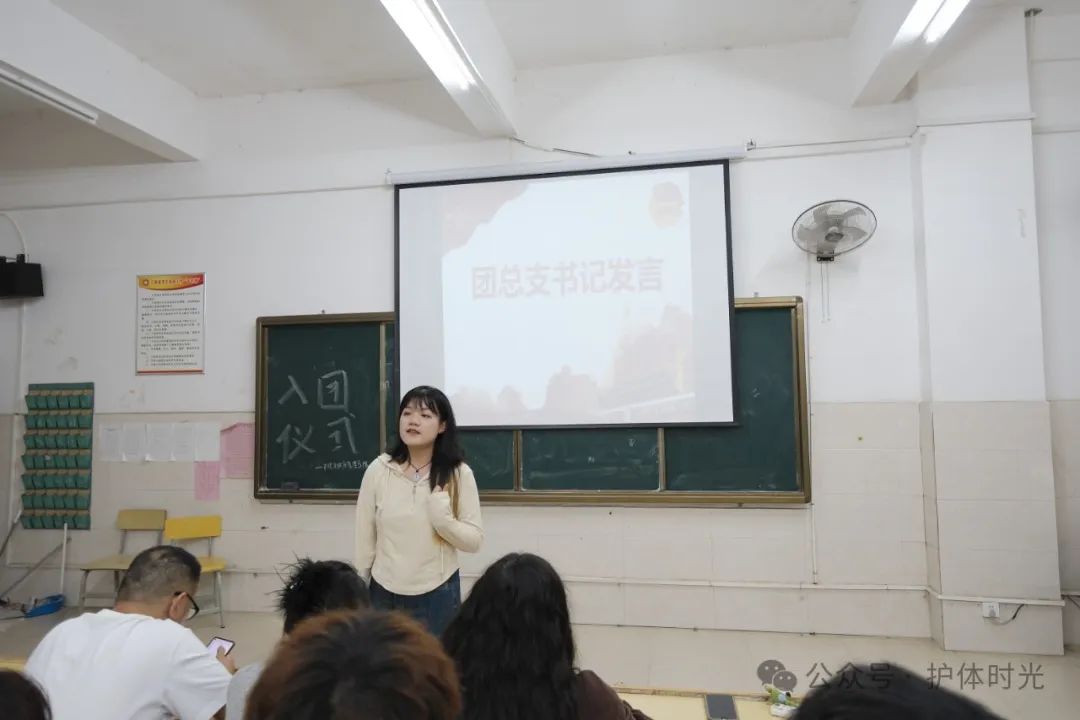 团总支书记陈思妤作总结发言,她希望新团员们能够时刻铭记自己的共青团员身份,不仅仅是在口头上,更要在实际行动中体现出来。她鼓励大家积极参与各种社会实践活动,提升自身的综合素质。在日常生活中要保持积极向上的态度,勇于面对挑战,不断学习和进步,为实现个人理想和社会发展目标贡献自己的力量。