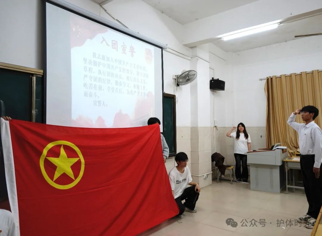 全体新发展团员在领誓人王明的带领下,举起右拳,面向团旗庄严宣誓。