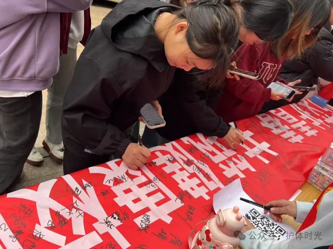 随后的签名环节,长长的横幅前,同学们郑重地签下自己的名字,许下对防艾行动的承诺,一个个签名汇聚成校园防艾的坚定决心。志愿者们也在旁积极给大家介绍相关知识,细致讲解防艾知识要点,助力大家更深入了解这一全球性公共卫生问题。