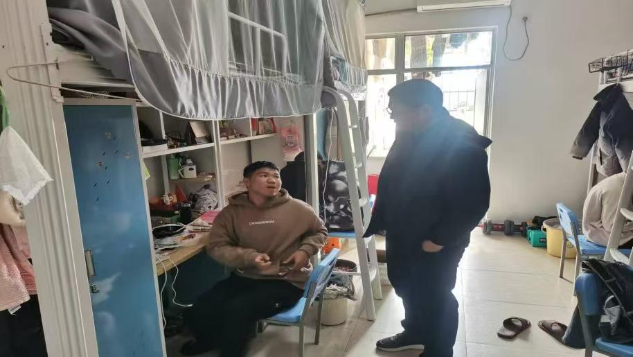 陈细庆主任十分关心学生的学习、生活以及住宿环境情况。在走访过程中,他亲切地与学生交谈,耐心倾听学生们的心声,逐一了解他们在学习上的进展和困难,为学生们提供了学习方法和建议,鼓励他们积极进取,努力提升自己的专业素养。同时,陈主任还仔细询问了学生们的生活状况,关心他们是否适应学校的生活节奏,提醒学生们要注意合理安排时间,保持良好的生活习惯。对于住宿环境,陈主任认真查看了宿舍的设施设备,询问学生们是否有需要改进的地方,确保学生们能够在一个舒适、安全的环境中生活和学习。