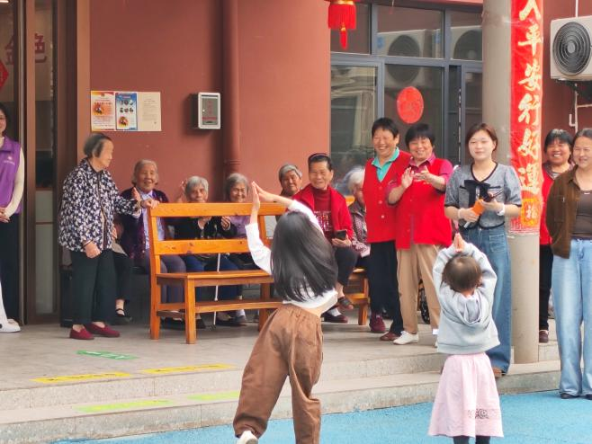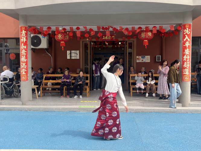 活动在欢快的歌舞表演中拉开序幕。志愿者们精心编排了红色经典歌曲合唱、拉丁舞、吉他演奏、民族舞蹈等节目。一旁的小朋友在氛围的感染下也跳起了欢快的傣族舞。台下老人随着旋律轻声哼唱,掌声与笑声此起彼伏。表演结束后,支部党员为每位老人送上红围巾和握力球,老人的脸上洋溢幸福的笑容。