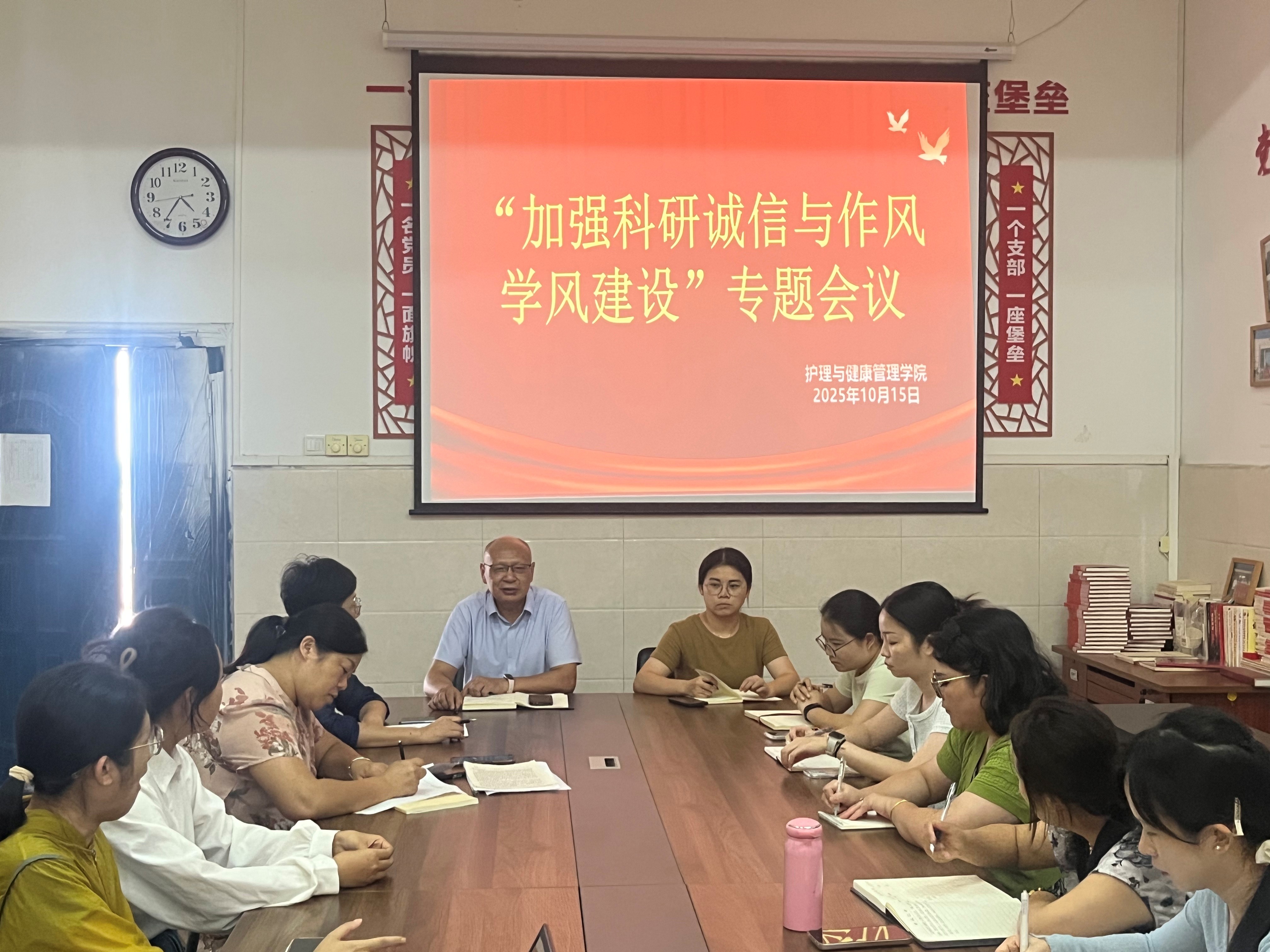 为深入贯彻落实教育部、江西省关于科研诚信建设的系列部署,筑牢学术诚信防线,10月15日下午2点,护理与健康管理学院在教学楼5栋5楼党员活动室召开 “加强科研诚信与作风学风建设” 专题会议。学院院长高书亮主持会议,全体教师参会。