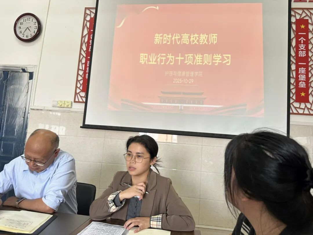 为进一步加强教师队伍建设,提升管理规范化水平,护理与健康管理学院于10月29日在学院会议室组织召开《新时代高校教师职业行为十项准则》专题学习会。党总支书记陈欣主持会议,全院教职工参会。