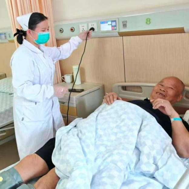 每一次为化疗患者做气压治疗时,我的心都格外郑重。看着病床上的章大爷——这位与肿瘤抗争数年的老人。我轻缓地为他套上气压治疗套,调试仪器时,他笑着对我说:“姑娘,你很细心。”连接管路、设定参数,充气时袖套规律地包裹住他的小腿,听他念叨家里孙儿的趣事。