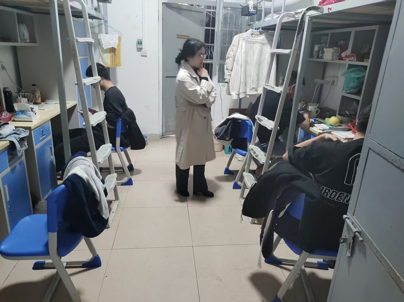 党总支书记陈欣与全体辅导员老师一同走进学生宿舍,了解同学们的生活环境,并对宿舍内的消防安全进行了全面检查。