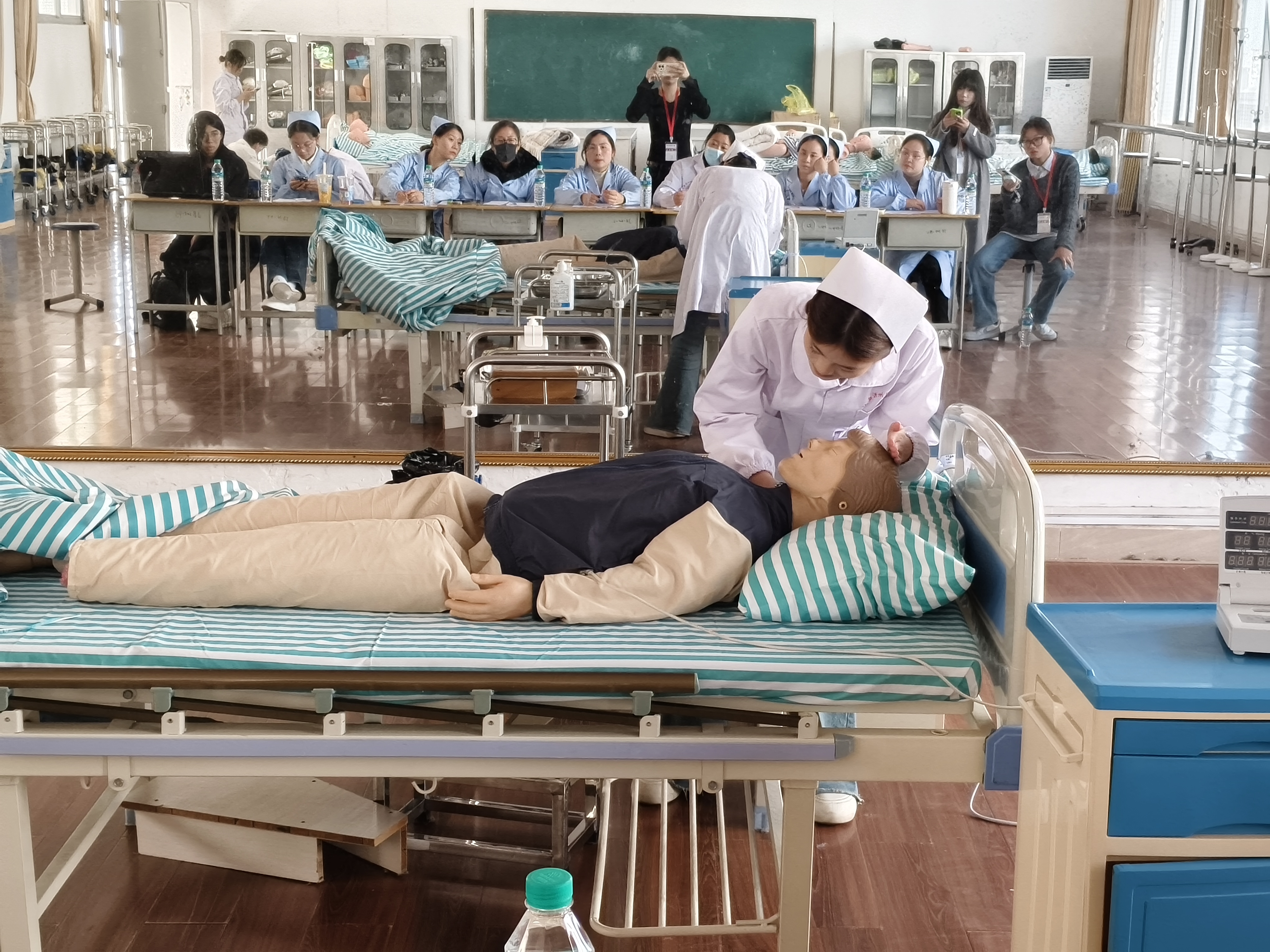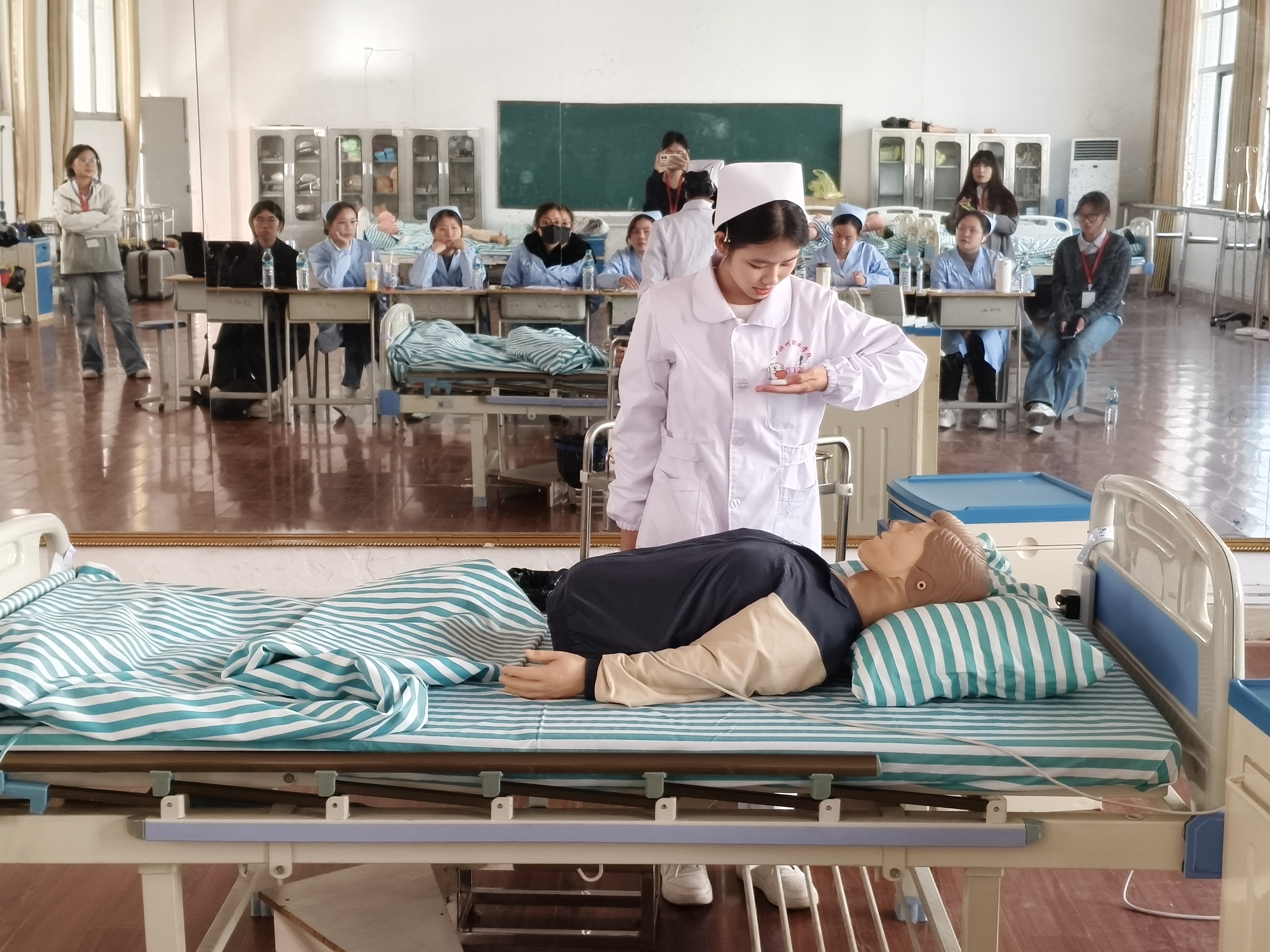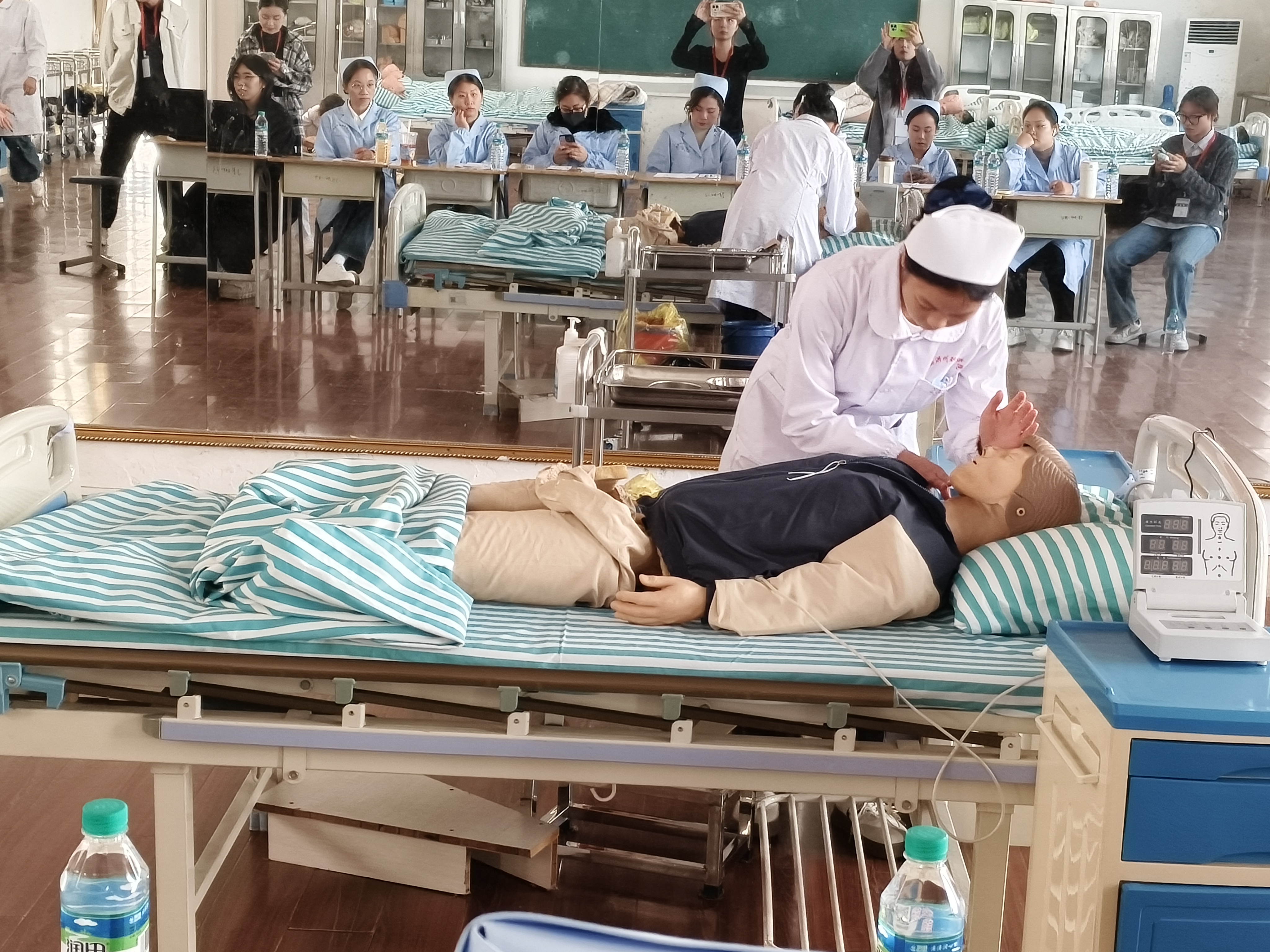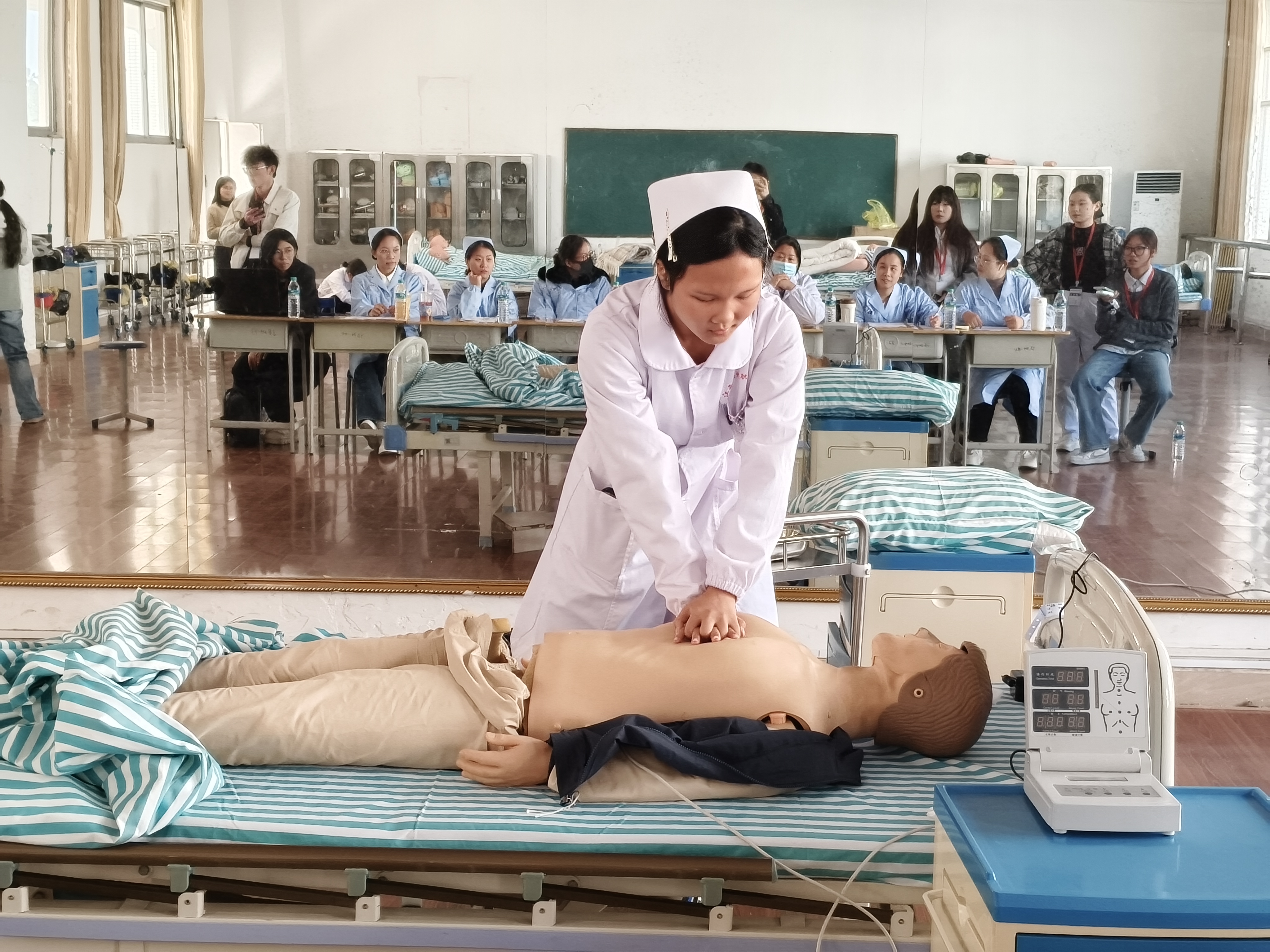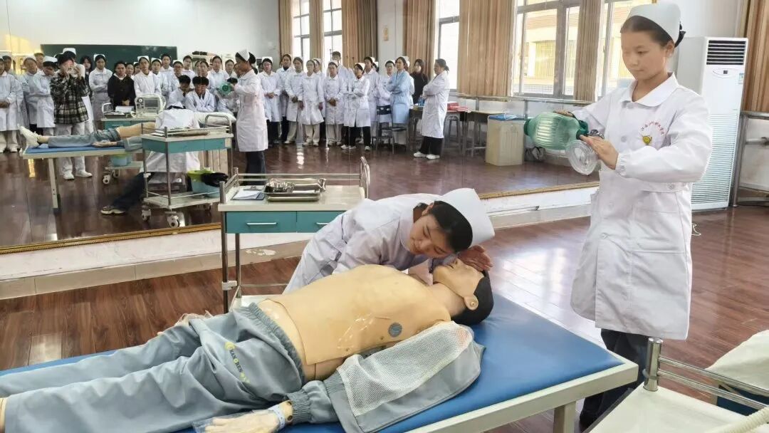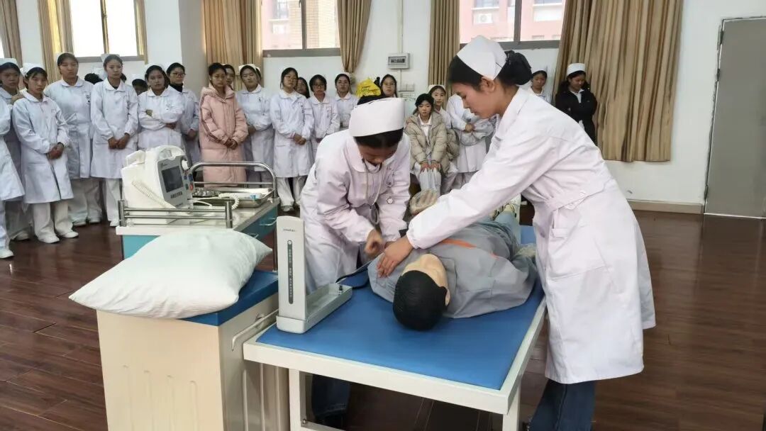 她们默契的团队配合、清晰的角色分工、以及高效连贯的抢救流程,深刻的印在了每一个同学的心中。这一展示不仅让同学们对心肺复苏技术有了更立体、更深入的理解,也生动展现了护理团队在真实急救场景中协同作战的专业风貌,为学弟学妹们树立了未来的学习标杆。