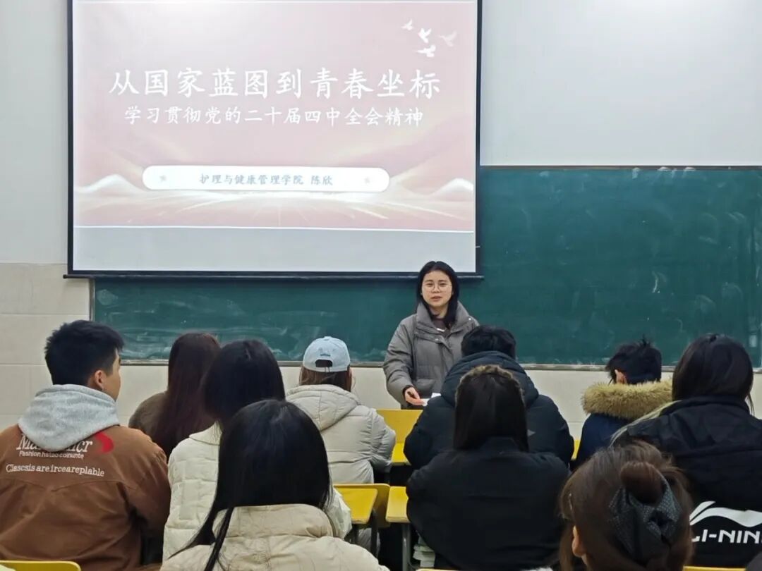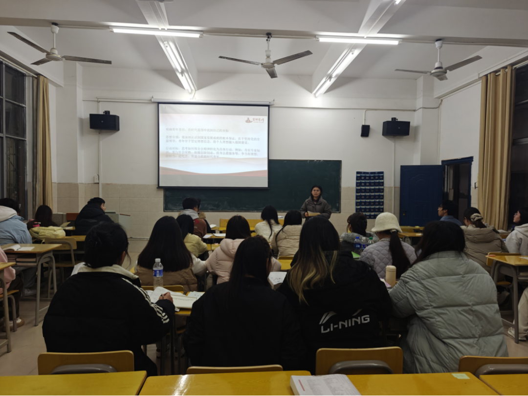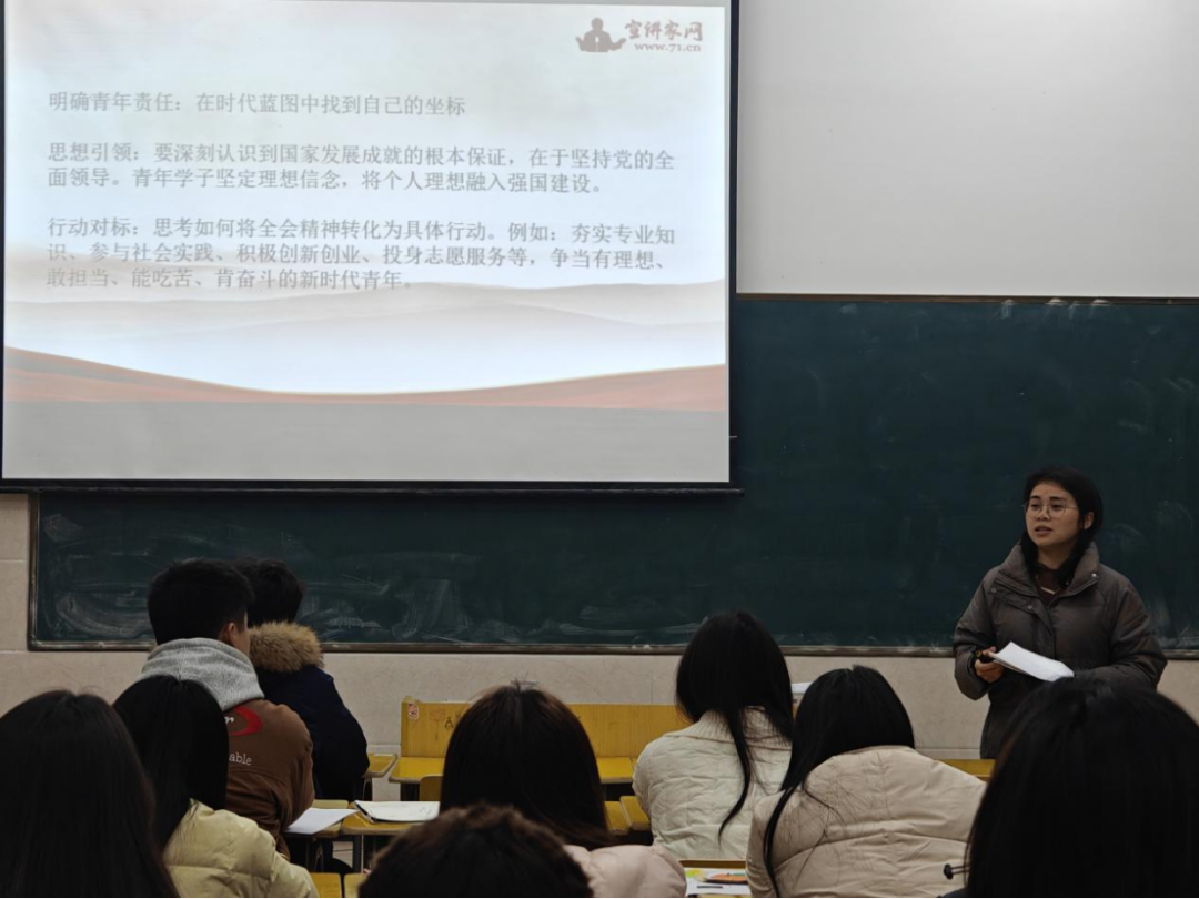 为及时传达学习全会精神,引导青年学子深刻把握国家发展大局与时代使命,我院于12月4日晚在6教102室组织“从国家蓝图到青春坐标”学习贯彻党的二十届四中全会精神专题党课。本次党课由学院党总支书记陈欣主讲,全体入党积极分子参加。