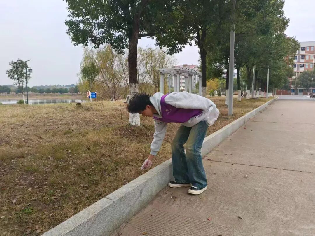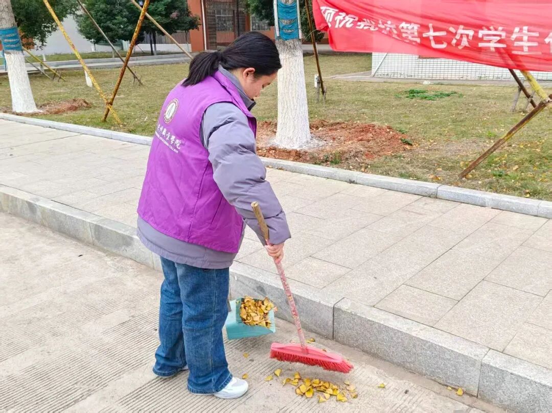 活动当天,志愿者们手持扫帚、垃圾夹等工具,在校园教学楼前、步道阶梯等区域分工协作。大家认真清扫路面的落叶与杂物,弯腰捡拾散落的烟头、纸屑。紫色的志愿马甲在校园里汇成一道亮眼的风景线,同学们不怕脏、不怕累,用双手让校园的每一个角落都变得整洁有序。