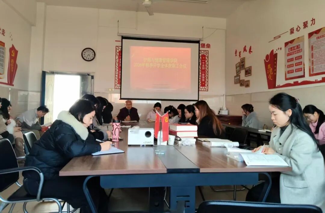 会上,院长高书亮首先传达了学校中层干部会议精神,带领全体教师深入学习领会学校在新一年的战略部署和工作重点。而后立足学院实际,详细解读了《护理与健康管理学院2026年工作计划》,从学科建设、教学改革、科研创新到人才培养,明确了新一年的奋斗目标与实施路径,为新学期各项工作指明了方向。