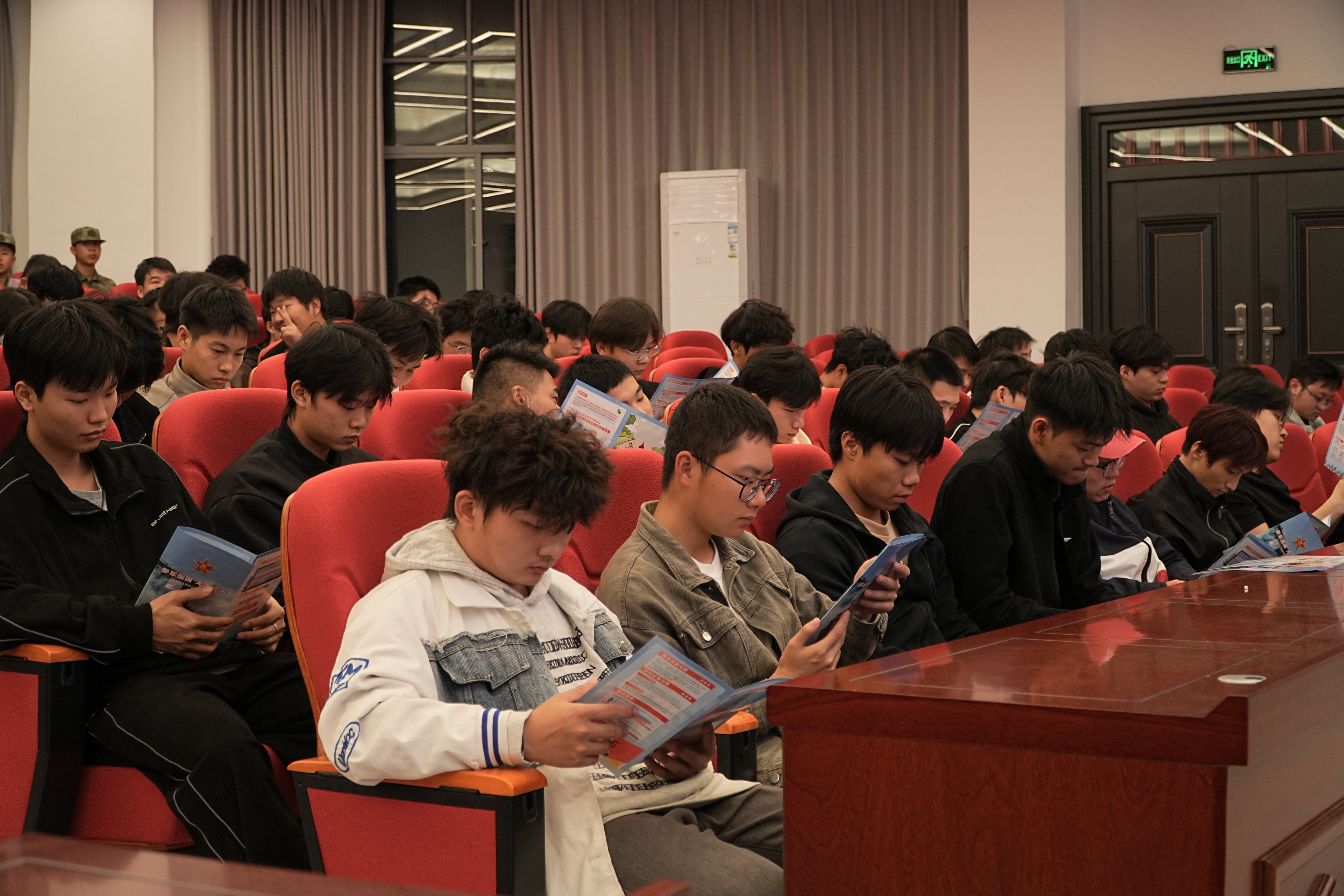 丰城市征兵办王峰科长作了动员宣讲,他说,好男儿志在军营,应该积极响应祖国号召,自觉接受祖国的挑选。鼓励学生踊跃报名应征,投身火热的军营,让青春在部队大熔炉中淬火成钢、在保卫祖国的战斗岗位上闪光,为实现强国梦、强军梦贡献青春和才智。宣讲现场还发放了征兵宣传手册。