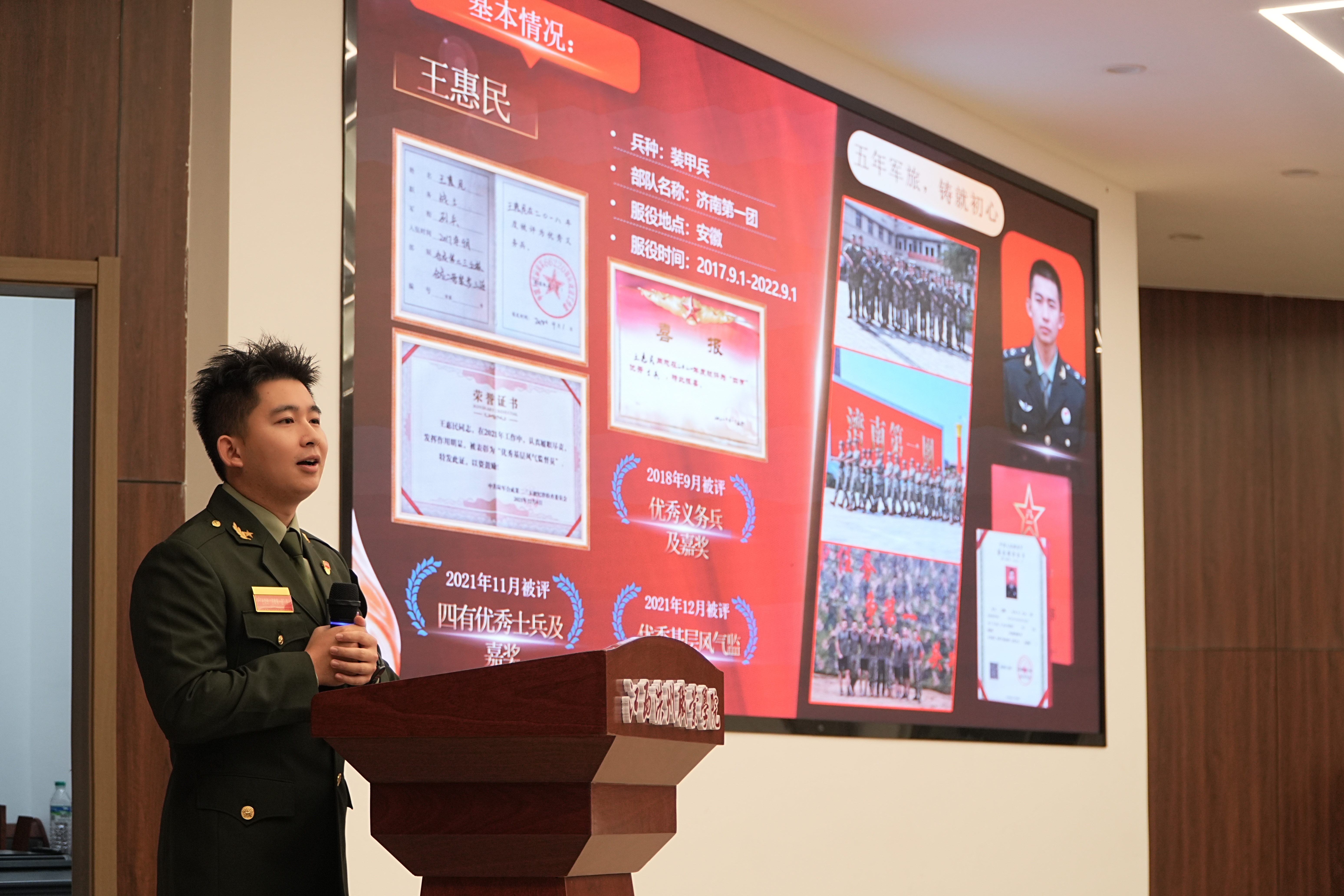 宣讲会现场,退役复学大学生王惠民分享了自己的从军经历和在校学习的所获所感。学校征兵工作站站长毛宁从现行征兵认知、大学生应征入伍条件及程序、大学生体格体检标准及政治考核要求、大学生入伍优待政策四个方面为学生进行了详细解读。
