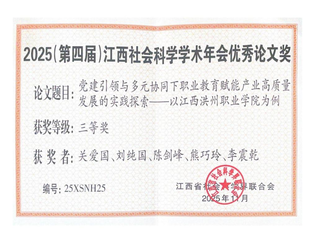 近日,由江西省社会科学界联合会主办的2025(第四届)江西社会科学学术年会优秀论文评选结果正式揭晓。我校党委委员、副校长关爱国作为第一作者,与刘纯国、陈剑峰、熊巧玲、李震乾共同完成的论文《党建引领与多元协同下职业教育赋能产业高质量发展的实践探索——以江西洪州职业学院为例》,荣获优秀论文三等奖(证书编号:25XSNH25)。