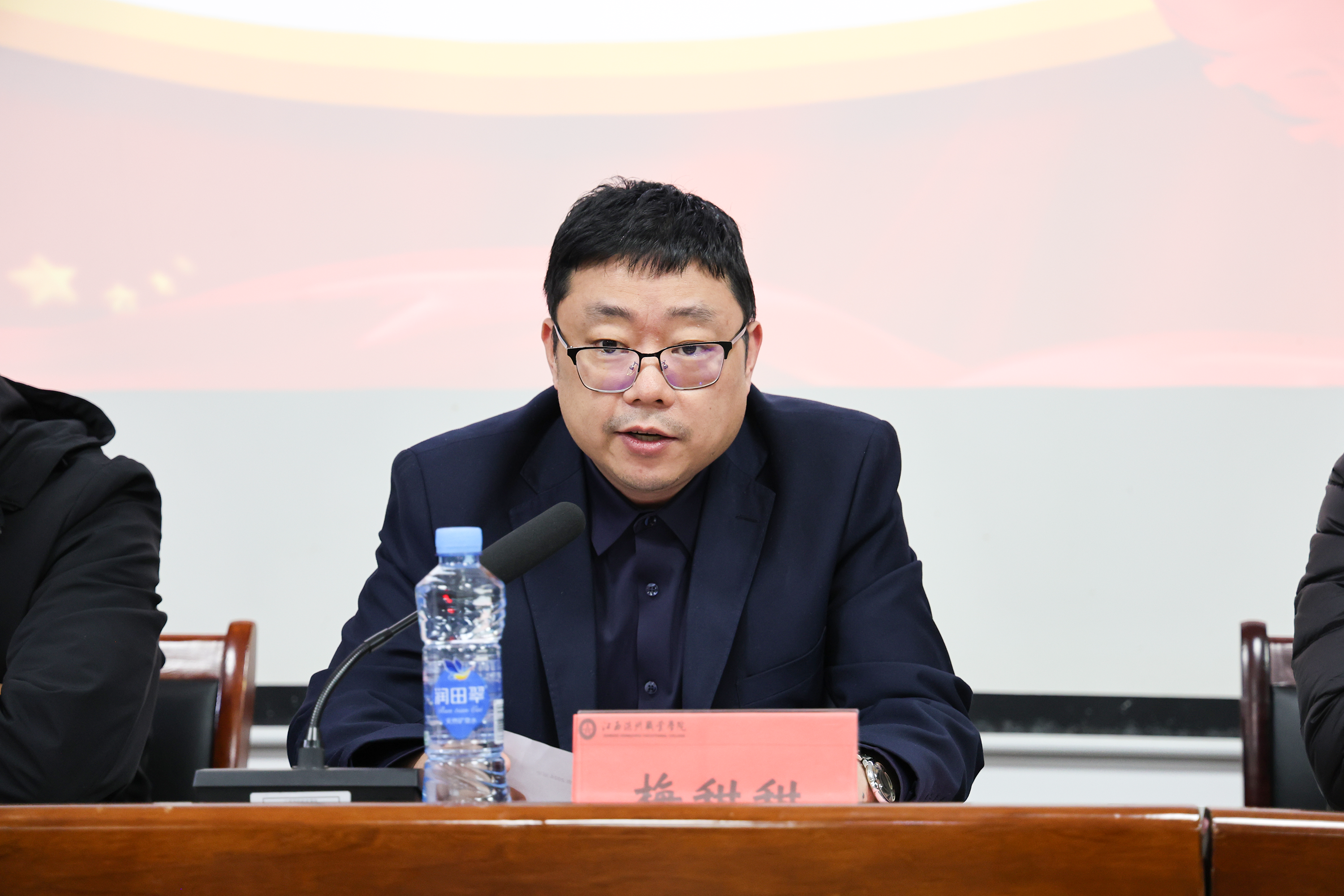 12月24日下午,学校在图书馆一楼学术报告厅隆重召开2025届毕业生就业工作总结表彰暨2026届毕业生就业工作推进会。学校党委书记、督导专员梅甜甜,校长刘权辉,副校长陈剑峰、关爱国、傅箭星、金红艳,纪委书记熊巧玲及各职能部门负责人、各二级学院党政负责人、学工办主任、全体辅导员及就业指导服务中心全体成员参加会议。党委委员、副校长关爱国主持会议。