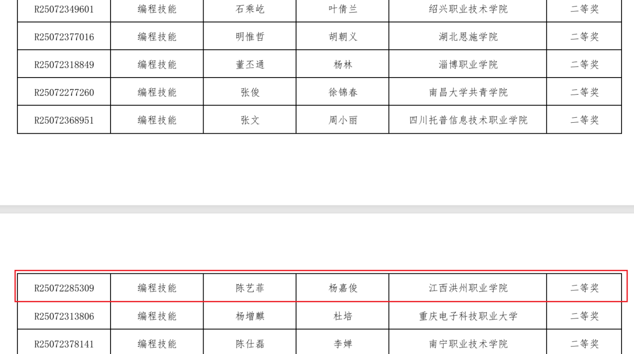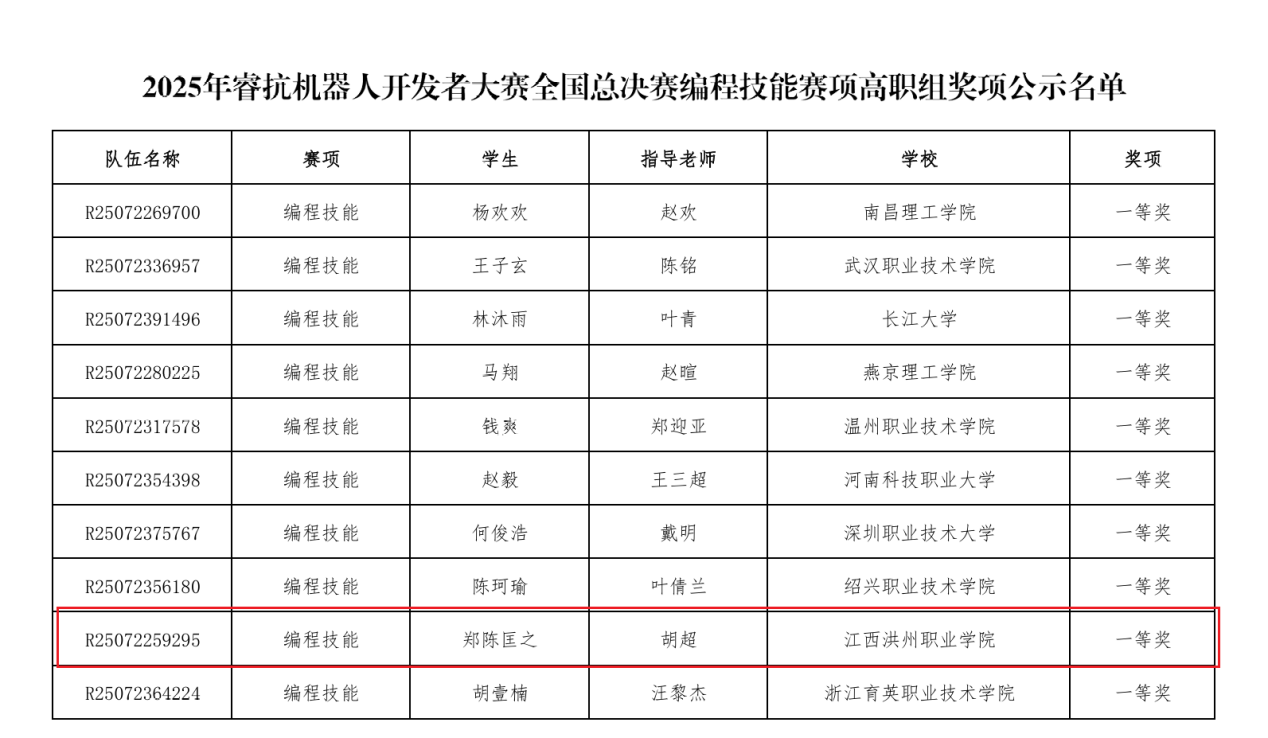 8月22日,2025睿抗机器人开发者大赛全国总决赛编程技能赛项高职组成绩公布,我校数字产业学院24级学生郑陈匡之获得全国一等奖(排名全国第九)、陈艺菲获得全国二等奖,这是我校首次参加该项赛事并进入全国总决赛,也是继数字人赛项获得全国一等奖后,我校学子再次斩获编程技能赛项全国一等奖。