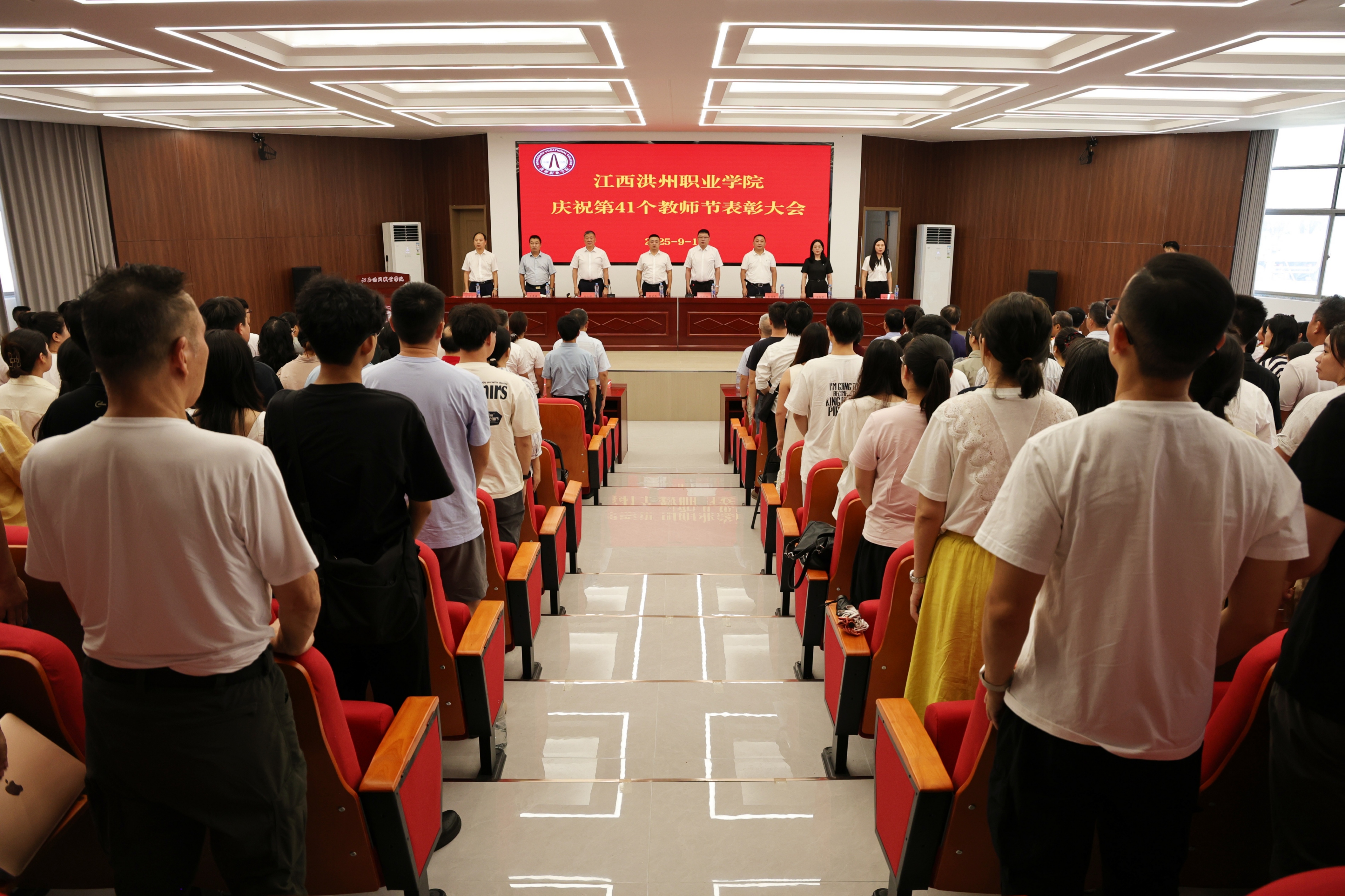 杏坛芬芳,桃李情浓。6号教学楼一楼学术报告厅气氛喜庆、热烈。9月10日下午,学校以“以教育家精神铸魂强师,谱写教育强国建设华章”为主题,隆重举行第41个教师节表彰大会。学校理事长陈建兵,党委书记、督导专员梅甜甜,校长刘权辉,副校长陈剑峰、关爱国、金红艳、傅箭星,纪委书记熊巧玲,与全体教职工齐聚一堂,共庆属于教育工作者的荣光时刻,共话立德树人的初心使命,共谱教育强国新的华章。表彰大会由党委书记梅甜甜主持。