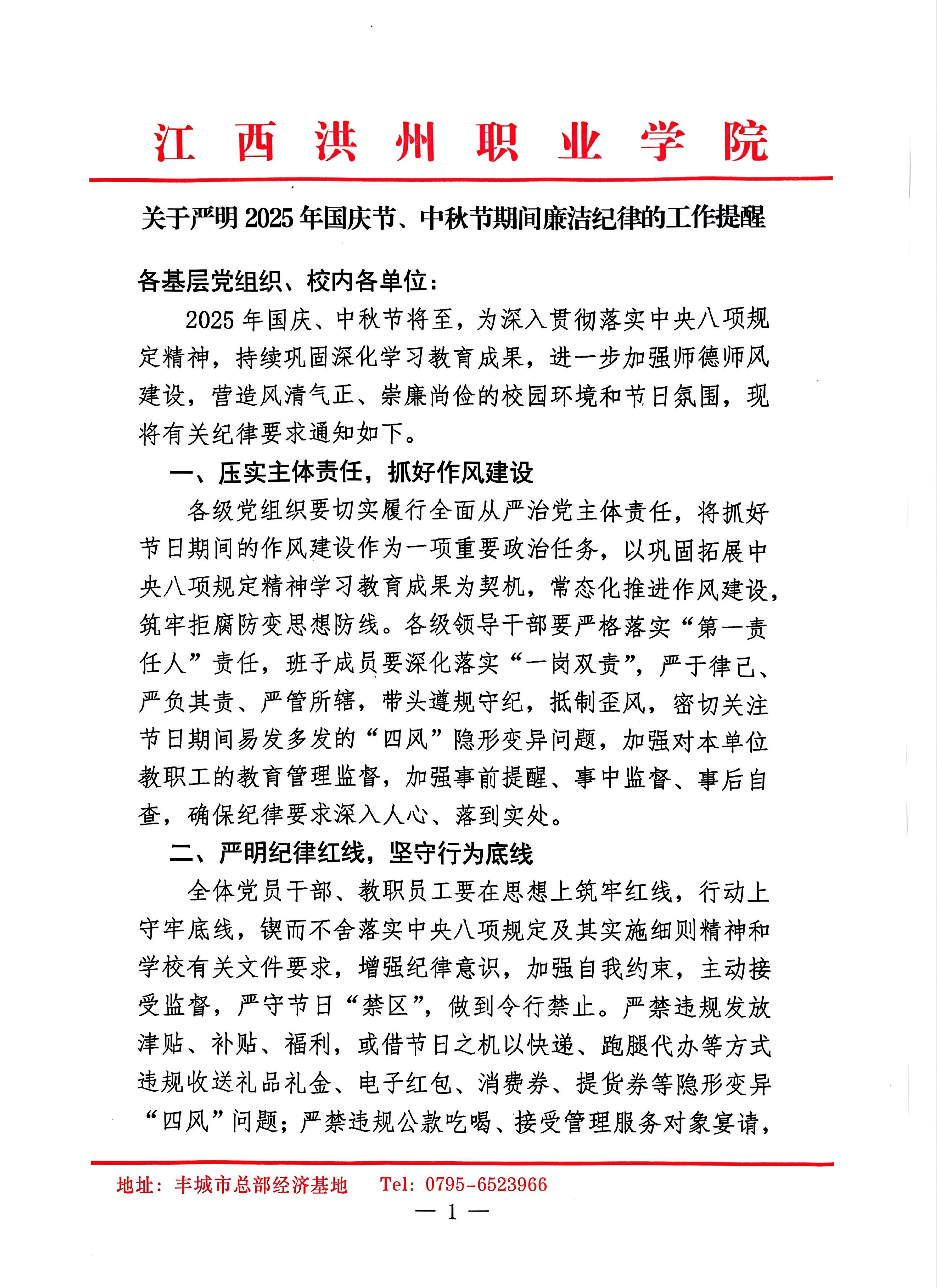 首页栏目 新闻综合 美丽校园 通知公告 下载中心 媒体关注 学校视频 通知公告 当前位置: 首页 > 首页栏目 > 通知公告 > 正文 关于严明 2025 年国庆节、中秋节期间廉洁纪律的工作提醒 时间:2025-09-29 责任编辑:李华丹 初审:李华丹 二审:陈玉清 终审:杨金平 阅读量:271 下一篇:江西洪州职业学院2025年统招招生简章