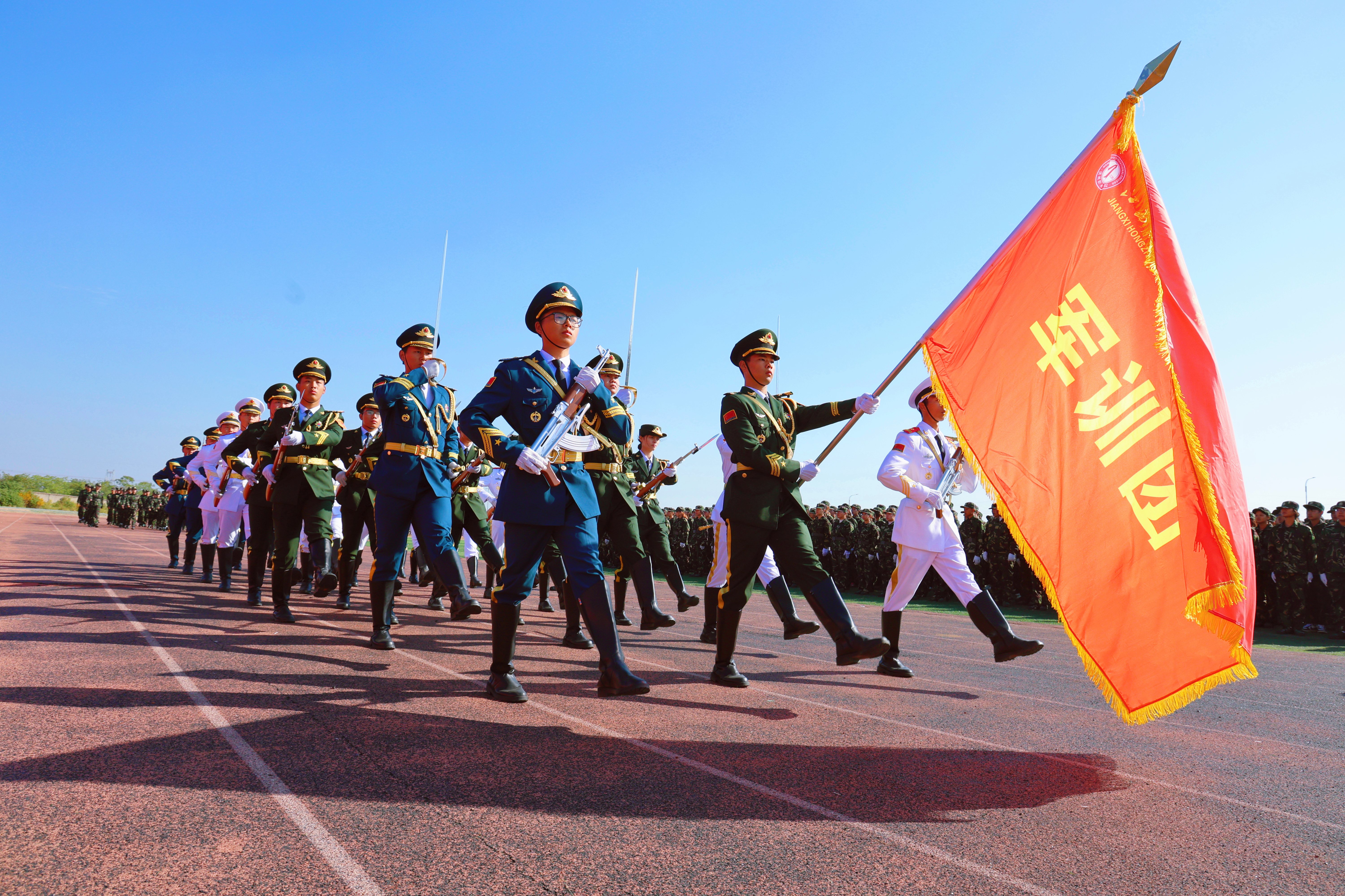 庄严的升旗仪式后,礼炮起,军训成果验收正式开始,接受检阅的新生们身着戎装,精神振奋。