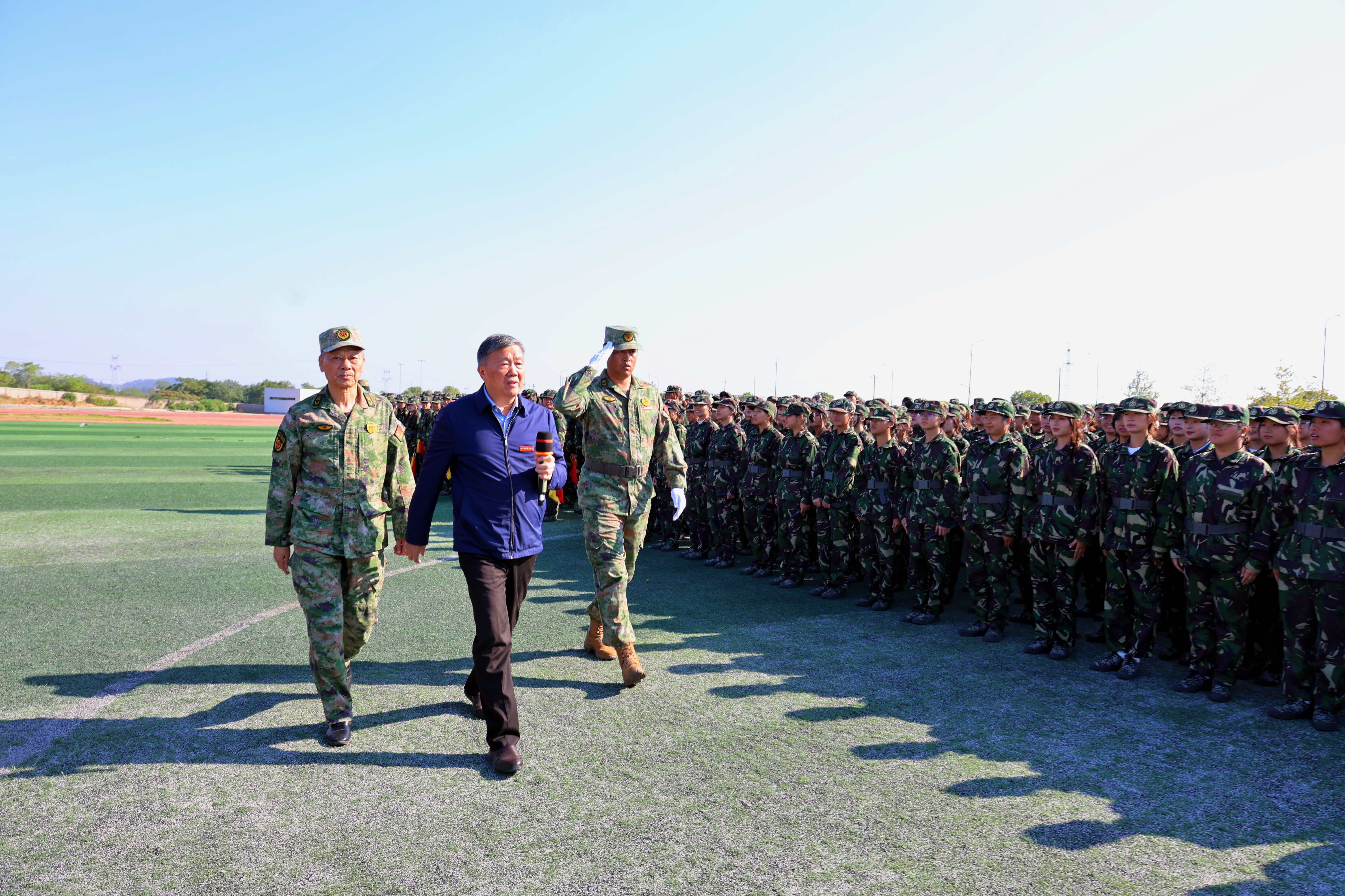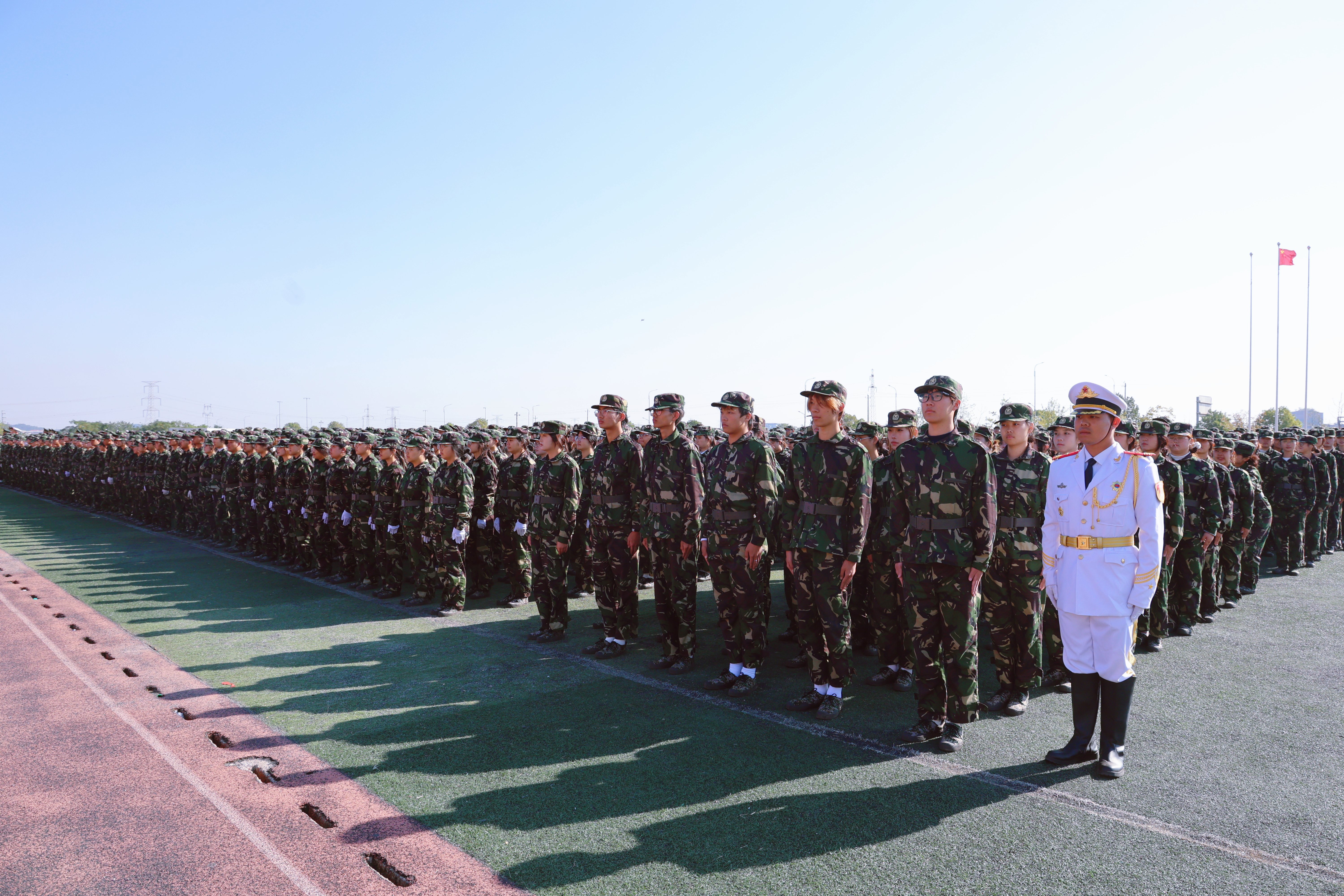 田径场上,各方队排列有序,整装待发,接受检阅。校长刘权辉检阅新生军训方队。