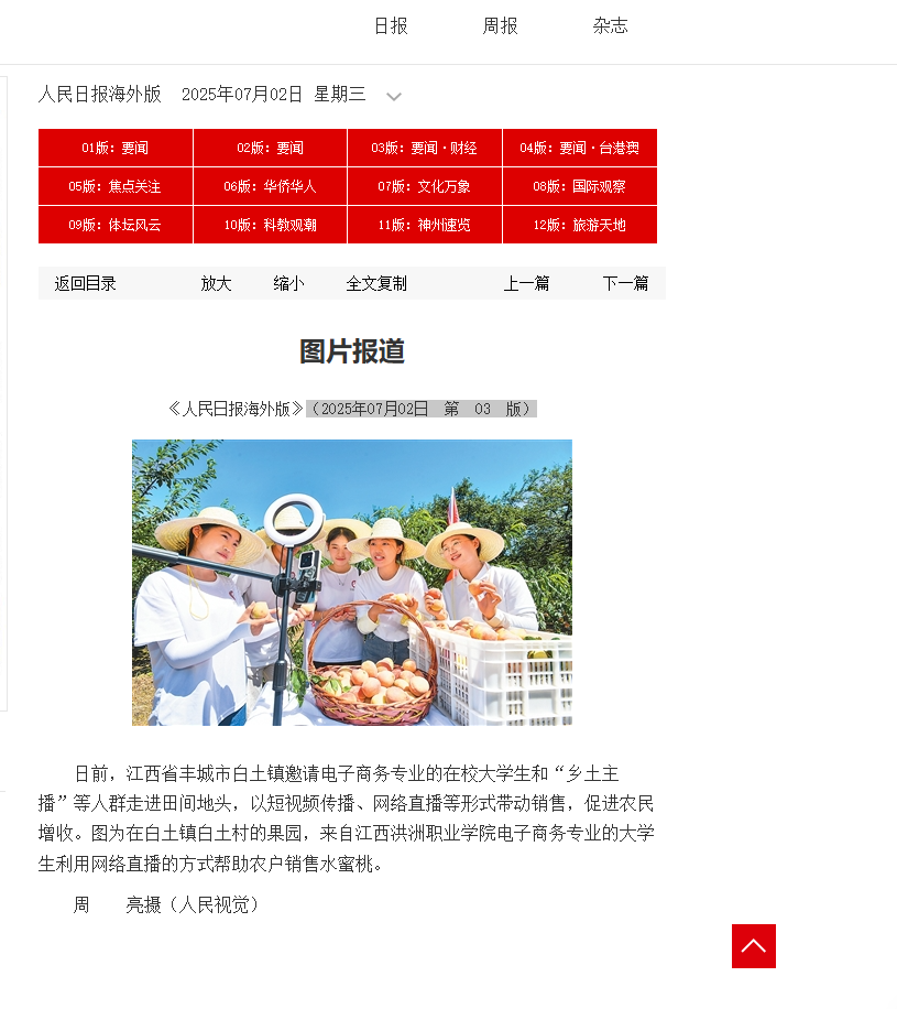 首页栏目 新闻综合 美丽校园 通知公告 下载中心 媒体关注 学校视频 媒体关注 当前位置: 首页 > 首页栏目 > 媒体关注 > 正文 【人民日报海外版】(2025年07月02日 第 03 版)图片报道 时间:2025-07-02 责任编辑:李华丹 初审:李华丹 二审:陈玉清 终审:杨金平 阅读量:168 上一篇:【大江网报道】江西洪州职业学院:7支队伍扎实开展暑期“三下乡”社会实践活动 下一篇:【大学生云报】青春“智”造力量,筑牢防溺水生命线
