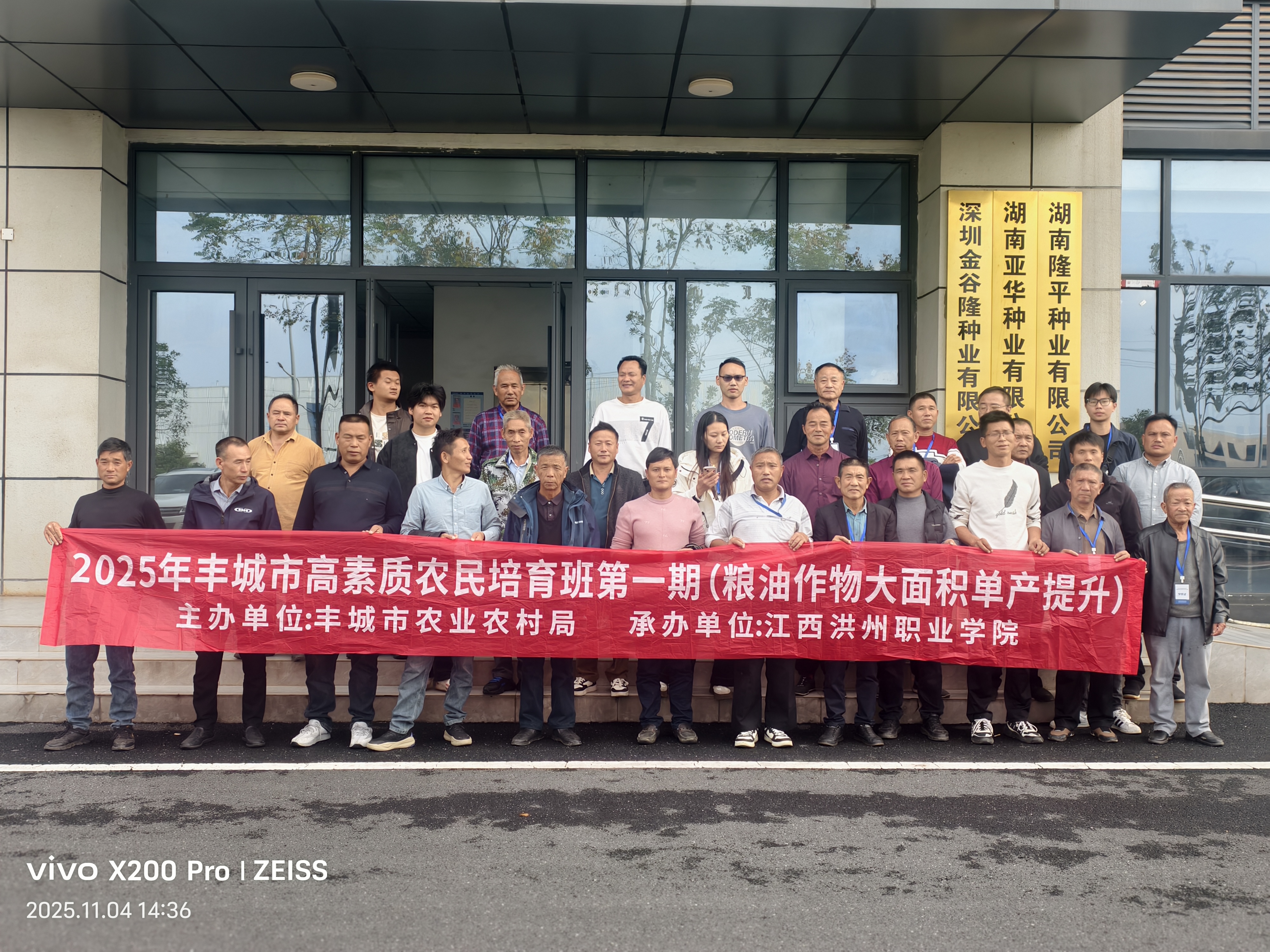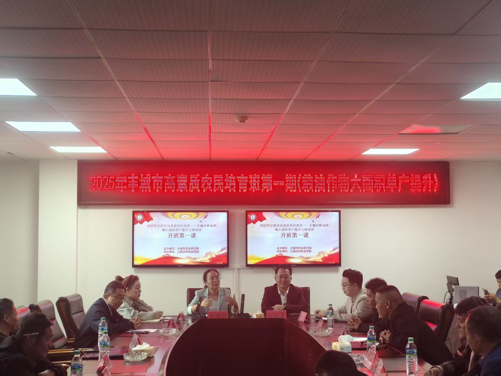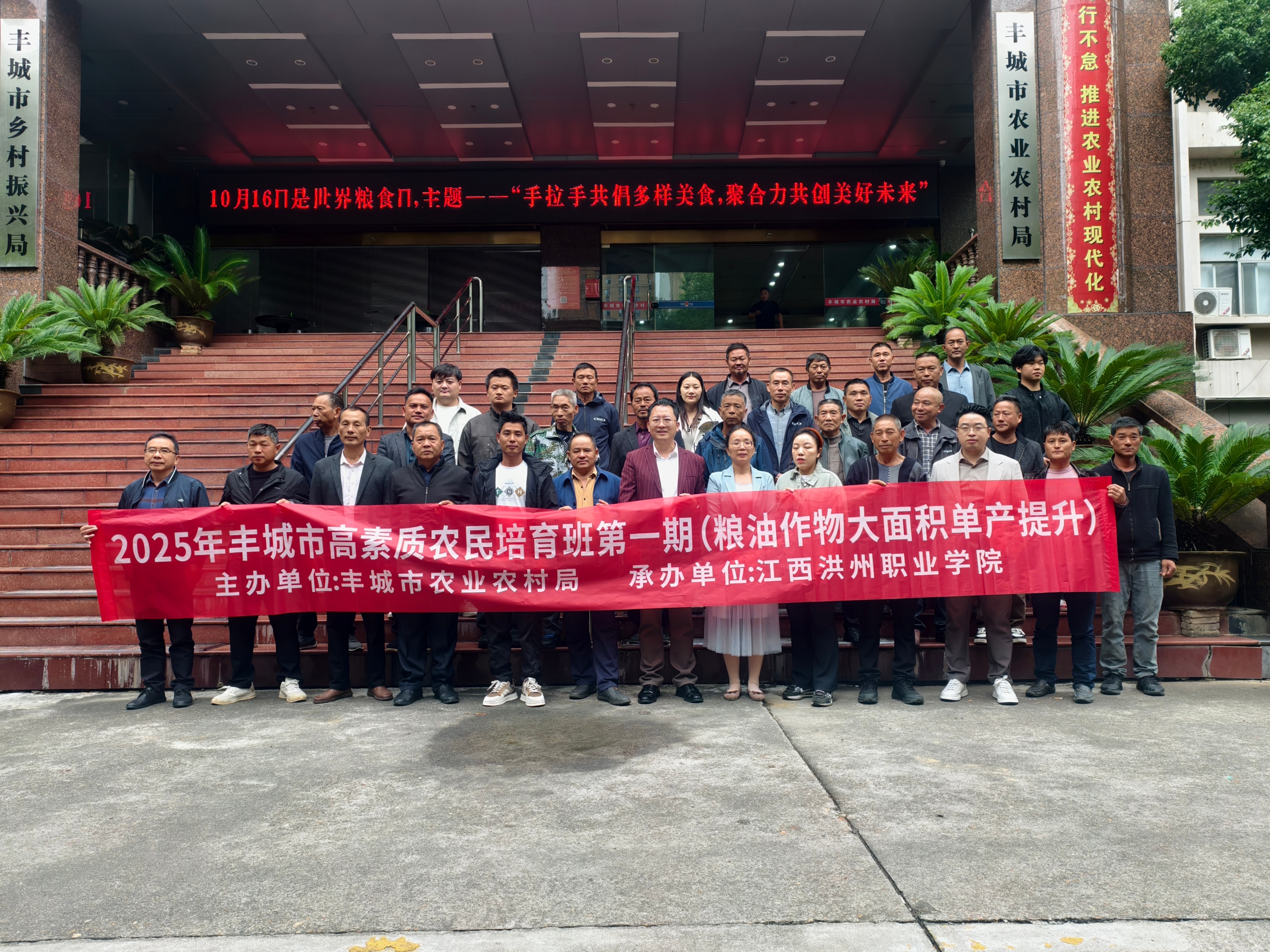 金秋时节,丰收在望。在这充满希望与收获的季节,11月6日,由丰城市农业农村局主办、江西洪州职业学院承办的2025年高素质农民培育项目(粮油作物大面积单产提升主体培育)班在丰城市农业局圆满结业。来自丰城市的30名粮油种植大户、家庭农场主顺利完成培训,为丰城市粮油产业高质量发展注入了新动能。副校长张春雷,职业培训中心负责人参加开班仪式。