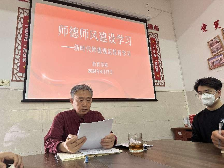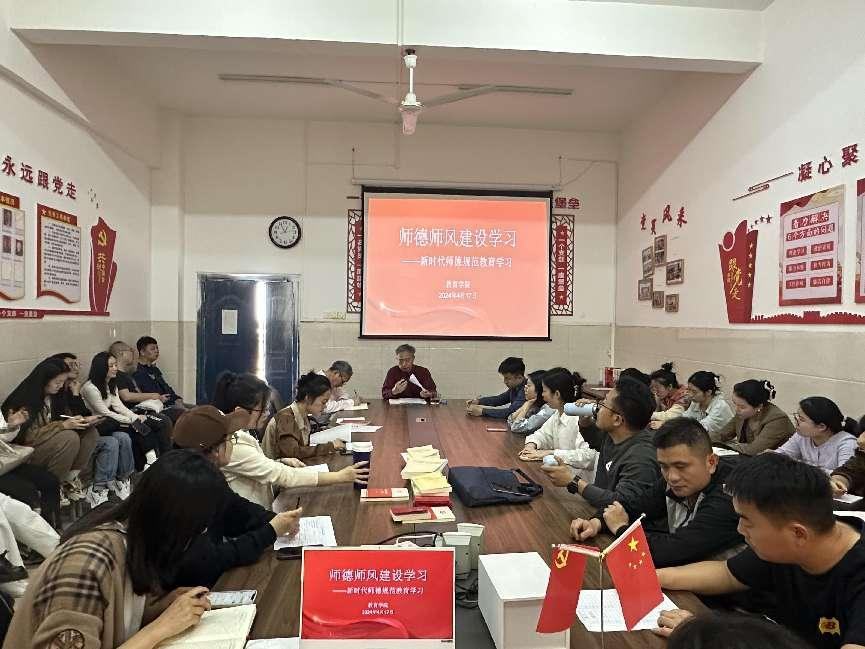 随着社会的快速发展和教育改革的不断深化,师德规范在新时代背景下的重要性日益凸显。为了进一步加强师德师风建设,提升教师队伍整体素质,弘扬新风正气,凝聚师德正能量,增强教师立德树人奋进担当的时代精神。教育学院4月17日下午在5栋5楼党员活动室召开了师德师风建设主题学习会议。会议由秦良院长主持。