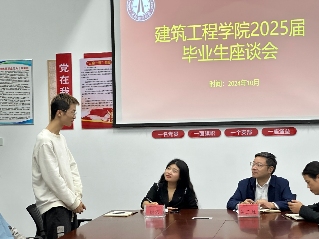 为深入贯彻落实“一把手工程”,积极响应国家关于高校毕业生就业工作的号召,更好地了解和帮助2025届毕业生明确就业方向、提升就业竞争力, 10月22日19点,建筑工程学院在会议室召开了毕业生座谈会。学院院长吴三胜、党支部副书记胡琴以及毕业班辅导员和2025届毕业生代表参加了此次会议。会议由学工办副主任洪为主持。