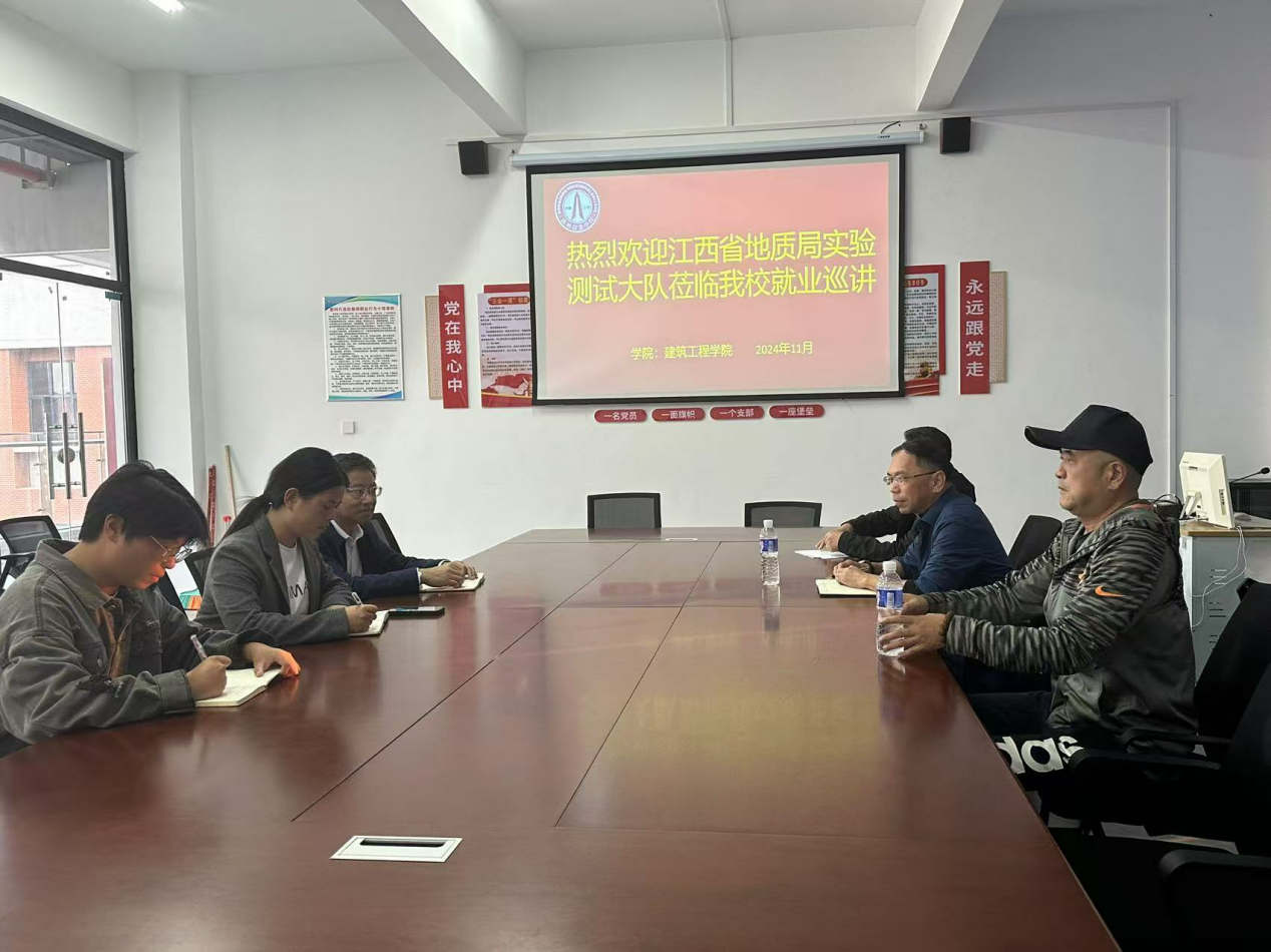 在新实训室五楼党员活动室举办企业进校园巡讲活动,江西省地质局实验测试大队纪委书记姚震一行莅临我院就业巡讲,助力我院的毕业生实习就业工作稳步开展。活动由建筑工程学院院长吴三胜主持,毕业班学生代表、毕业班辅导员及班主任参加了此次宣讲会。