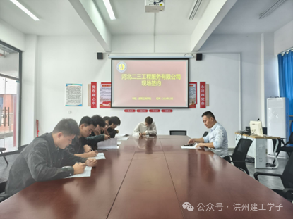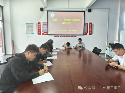 为了深入贯彻落实高校毕业生实习就业的决策部署,推动我院2025届学生岗位实习工作的顺利开展,建筑工程学院于10月31日在新实训室五楼会议室开展2025届毕业生实习三方协议现场签订活动。河北二三工程服务有限公司代表与我院2025届学生正式签订实习协议,此次活动在进一步提升实习质量明确各方权益和责任,为学生实习就业和企业发展打下坚实基础。