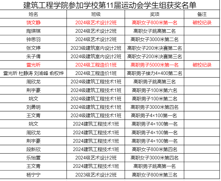 小结:时代的风浪越大,我们越要勇立潮头。建筑工程学院的学子们在坚持中超越自我,在团结中勇往直前,以坚韧不拔之志展示出建工学子的青春风采,运动员们用汗水和拼搏诠释了体育精神的内涵,让我们继续发扬这种勇于拼搏、团结协作、勇争一流的精神。最终,女子800米(2024级艺术设计2班饶文静)和男子5000米(2024级工程造价1班雷光昕)两个项目破校级纪录。