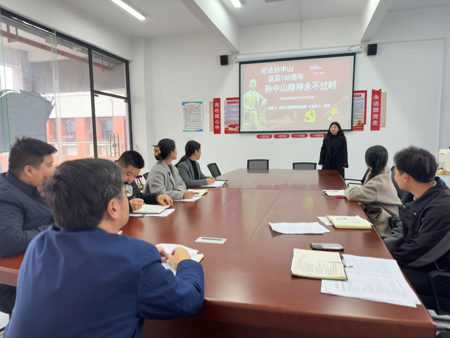 为深入贯彻落实二十大、二十届三中全会精神,继承和发扬孙中山先生的伟大精神,2024年11月20日下午,建筑工程学院党支部开展主题为“弘扬孙中山精神”主题党日活动。此次活动由党支部副书记胡琴主持,全体党员参与了此次活动。