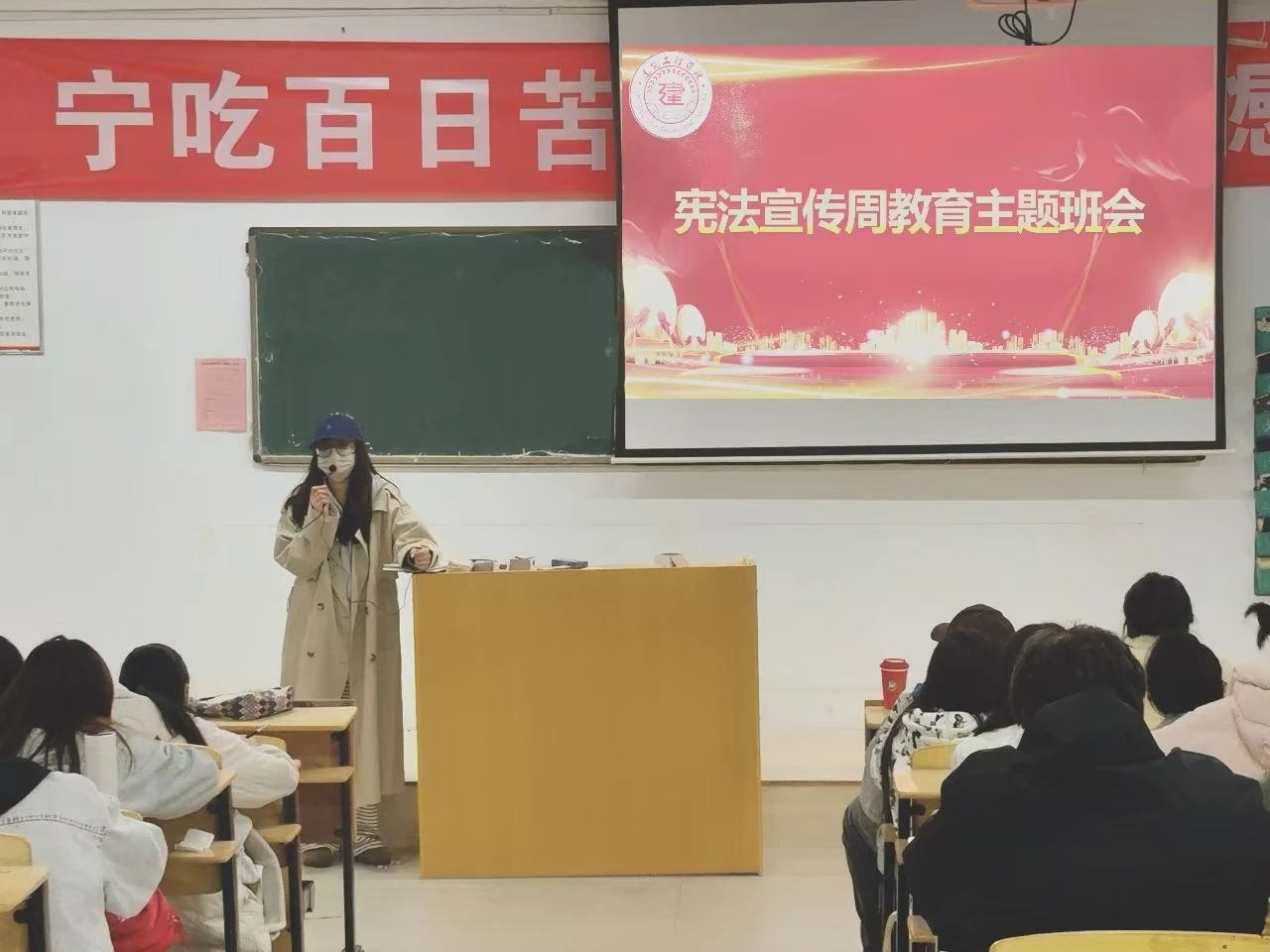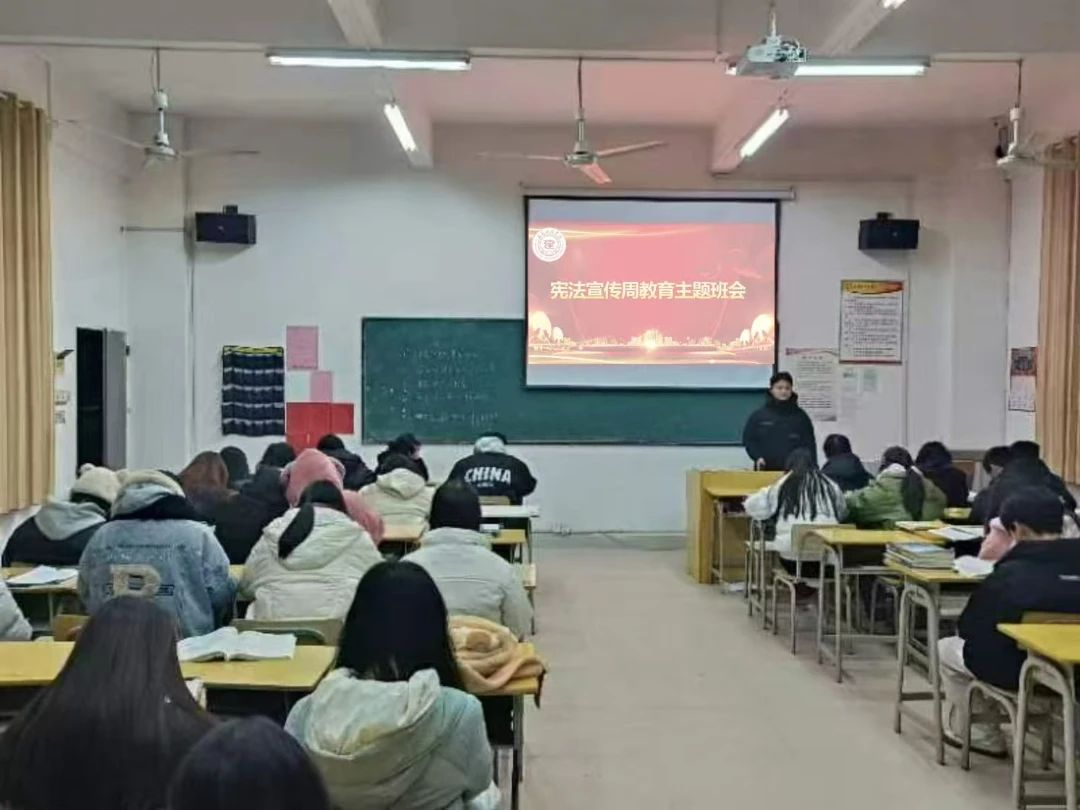 12月5日晚自习,学院开展《宪法伴我们成长》歌曲传唱活动。全体学生在辅导员的带领下,用清脆的歌声唱出对宪法的尊崇与热爱。歌曲以生动活泼的形式传播宪法知识,使学生们在潜移默化中接受法治文化的熏陶,将宪法宣传活动推向高潮。