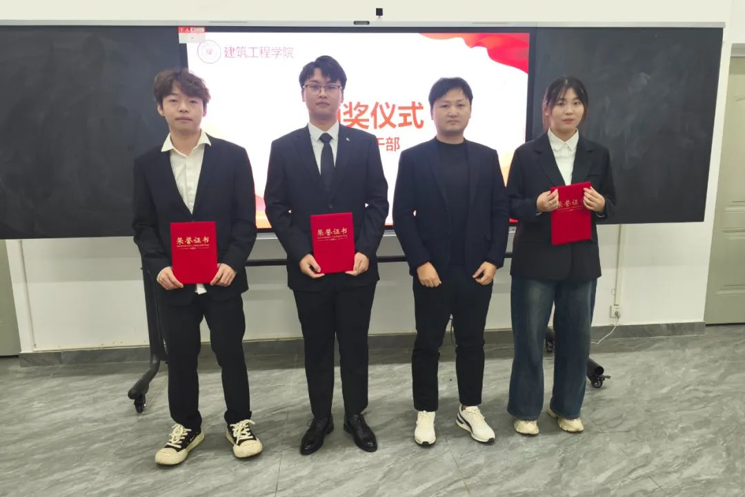 主持人龙菲庄重宣读2024—2025学年第一学期“优秀学生干部和优秀学生干事”名单。建筑工程学院团总支书记洪为为获奖同学颁发荣誉证书,并与他们合影留念。这一时刻,不仅是对优秀学生干部和干事们辛勤付出与杰出表现的高度认可与嘉奖,更为全体学生会成员树立了学习的榜样,激励着大家在今后的工作中奋勇争先、追求卓越。