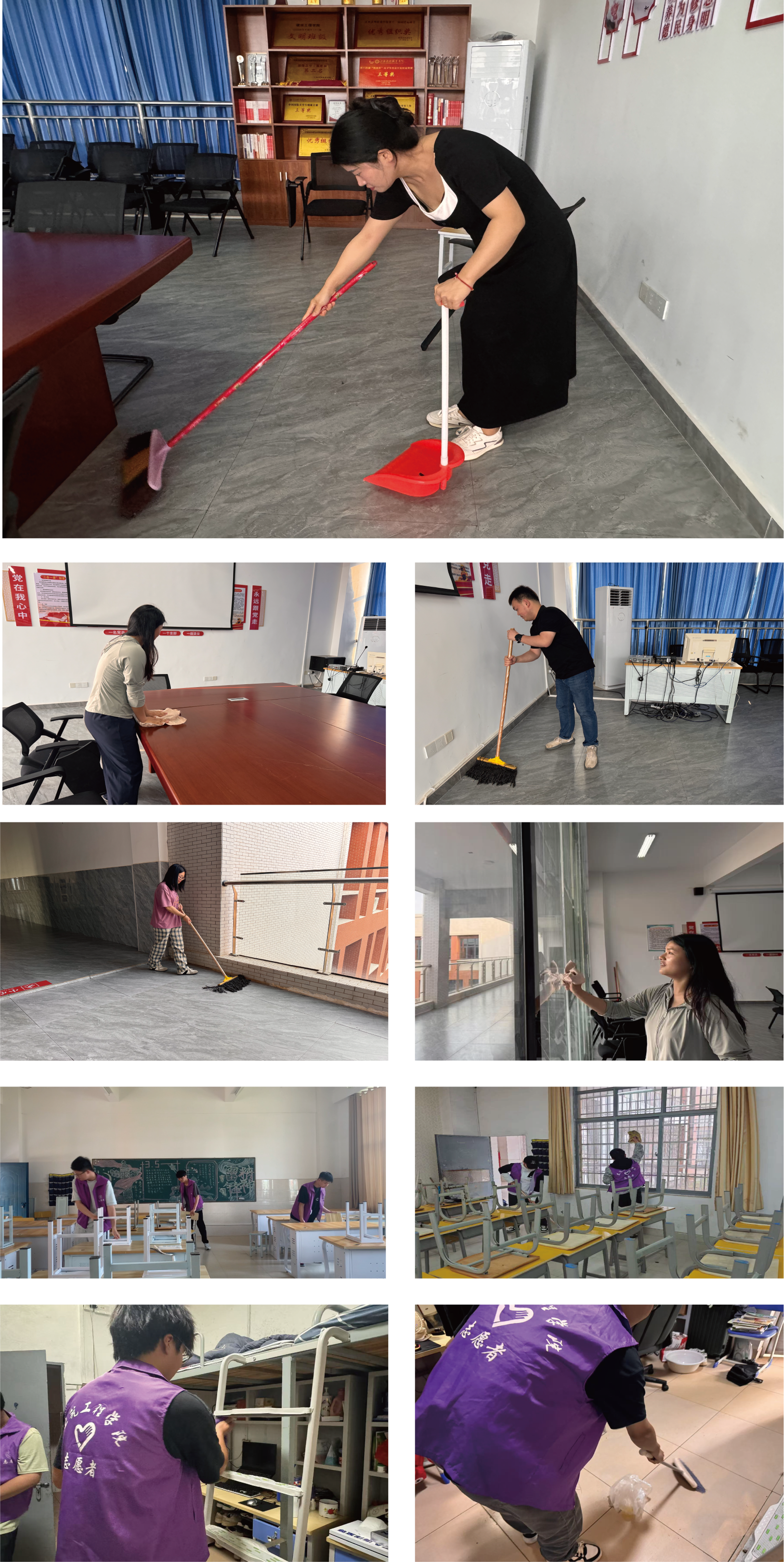 紧接着,党支部迅速将精神力量转化为实际行动。全体党员、入党积极分子及青年学生组成志愿服务队,开展“美化校园环境 党员先行”清扫活动。大家分工协作,对学院办公区域、教学区域、学生公寓进行全面清理,细致打扫走廊、教室、宿舍楼道,整理公共区域物品,用实际行动诠释劳动价值。经过两小时的努力,校园环境焕然一新,过往师生纷纷点赞。入党积极分子刘荣表示:“从理论课堂到劳动现场,我真正体会到‘知行合一’的意义,党员身份不仅是荣誉,更是服务师生的责任。”