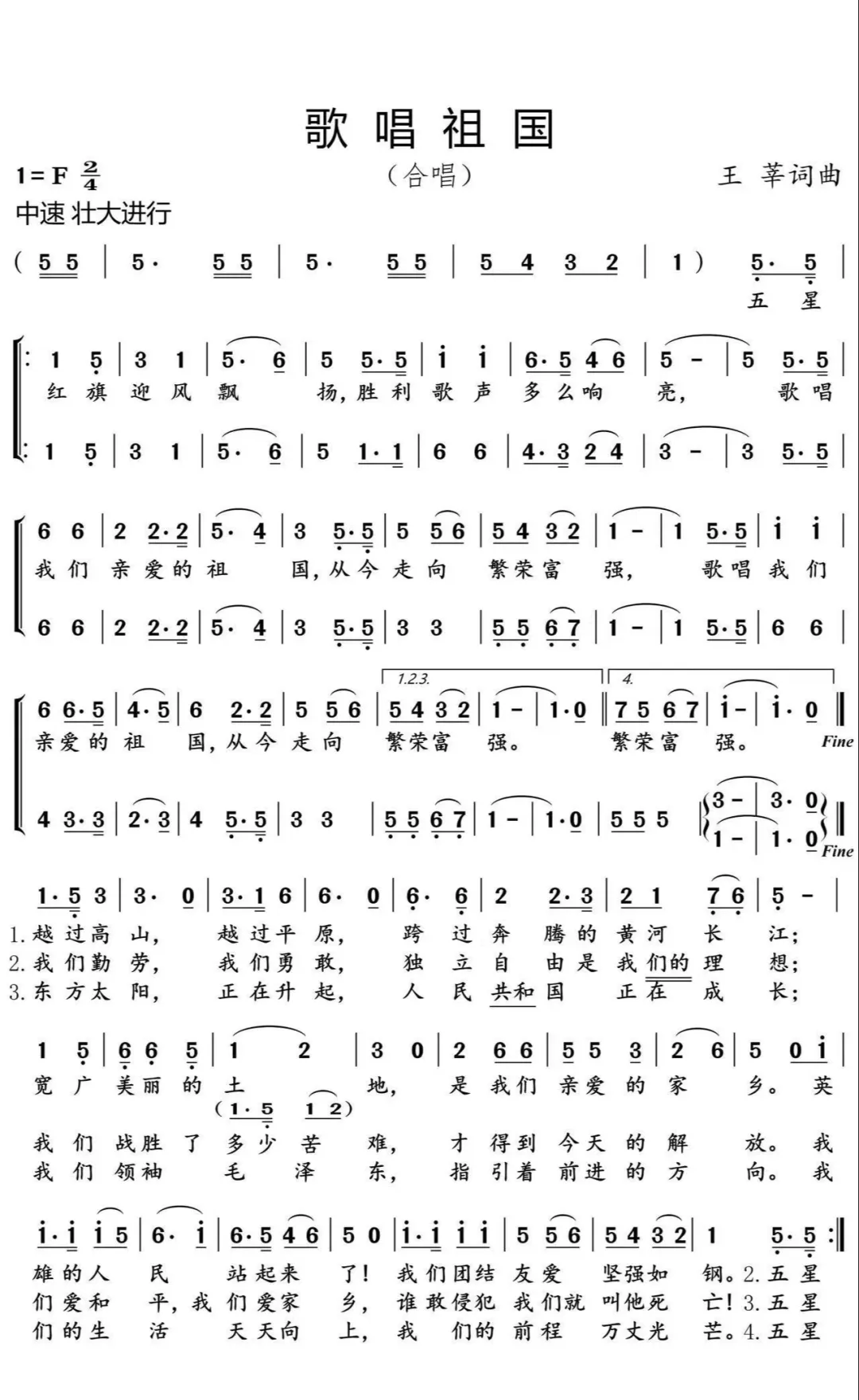 《歌唱祖国》以2/4拍、F大调为基调,采用“主歌-副歌-主歌再现”的三段式结构。主歌三段歌词层层递进:首段描绘开国大典的辉煌,次段回溯抗战艰辛,末段讴歌党的领导;副歌则以“歌唱我们亲爱的祖国,从今走向繁荣富强”的反复咏唱,将情感推向高潮。主歌旋律抒情叙事,副歌节奏铿锵有力,二者在节奏、音调上形成鲜明对比,刚柔并济间,勾勒出民族复兴的壮阔征程。