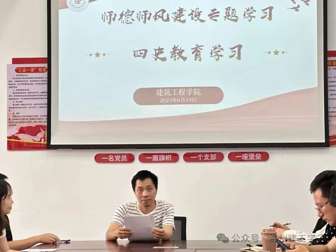 师德师风,作为教育事业的灵魂和根本,一直是我们教育工作者不懈追求的目标。为继续深入推进师德师风建设,2024年6月19日星期三,建筑工程学院在党员活动室开展了师德师风学习会暨四史教育学习。本次学习会旨在通过深入学习和领会四史教育(党史、新中国史、改革开放史、社会主义发展史)的精髓,进一步提升我们的师德修养,强化师风建设,为培养德智体美劳全面发展的社会主义建设者和接班人贡献自己的力量。