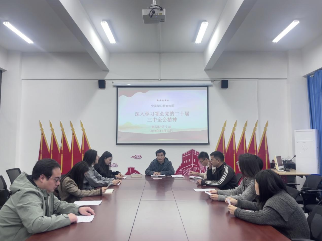 为认真贯彻执行党的二十届三中全会精神,根据校党委对政治理论学习工作安排,2024年11月13日,商学院党支部在新实训楼 c栋-4-3党员活动室开展了学习贯彻党的二十届三中全会精神专题学习会议和主题党日活动。会议由商学院党支部书杨旭华主持,商学院全体党员参与会议。