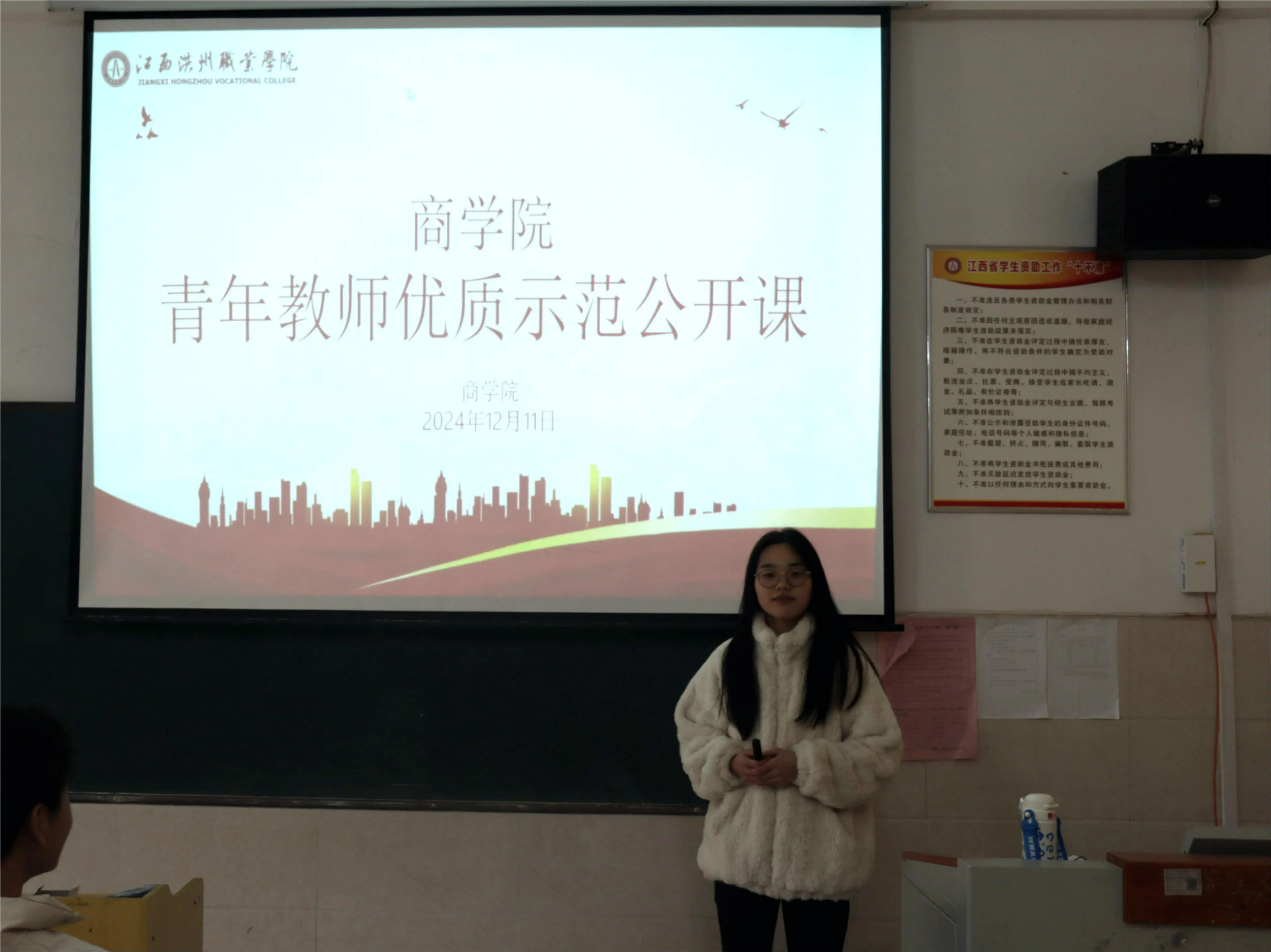 根据学校《2024年江西洪州职业学院思想政治工作要点》的工作安排,2024年12月11日下午,商学院在4栋教学楼402教室开展青年教师优质公开课活动,由商学院专职教师李雯怡授课,商学院院长邓小朱,全体专职教师参加公开教学活动。
