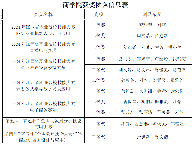 商学院秉持“以赛促教、以赛促学”的教育理念,将创新创业精神贯穿人才培养全过程,逐步形成涵盖学生成长全链条、丰富商科实践多场景、引领专业双创融合发展新赛道的创新创业人才培养模式,培养商业素养与人文气质共融的创新创业人才。自11月份以来,商学院学生在多项赛项中屡创佳绩,陆续获得2024年江西省职业院校技能大赛RPA 商业机器人设计与应用赛项二等奖2项,直播电商赛项三等奖1项,企业沙盘经营模拟赛项二等奖2项,云财务共享与数字场景应用二等奖1项、三等奖1项,电子商务赛项二等奖2项;第五届“首冠杯”全国大数据分析技能应用大赛二等奖1项;第四届“立信杯”全国会计技能大赛(RPA 商业机器人设计与应用)二等奖1项。这充分反映出商学院教学质量的稳步提高,彰显出商学院高素质技能型人才培养的成效。
