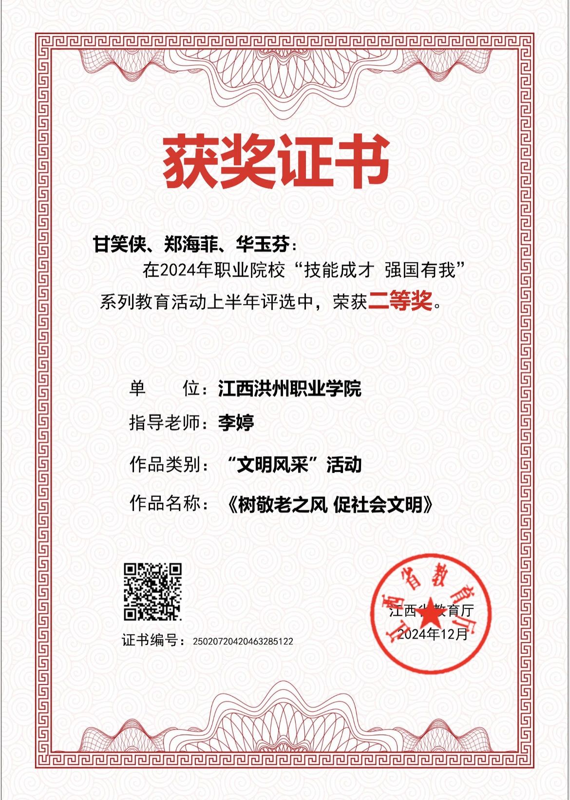 首页栏目 学院动态 实验实训 校企合作 学院简介 专业介绍 学院动态 当前位置: 首页 > 首页栏目 > 学院动态 > 正文 喜报 | 我院学子荣获“优秀大学生志愿者”&'技能成才 强国有我”系列教育活动二等奖! 时间:2025-03-10 初审:井云龙 二审:杨旭华 终审:邓小朱 阅读量:1424 获奖人:尕松才仁 尕松才仁同学扎根家乡热土,以志愿微光照亮青春之路,成为大学生“返家乡”社会实践的鲜活典范。 获奖人:甘笑侠、郑海菲、华玉芬 指导老师:李婷 恭喜甘笑侠同学、郑海菲同学、华玉芬同学在2024年职业院校“技能成才 强国有我”系列教育活动上半年参赛作品《树敬老之风 促社会文明》荣获二等奖! 上一篇:传承雷锋精神,绽放时代光芒|雷锋月志愿活动系列(一) 下一篇:品家乡风土人情,聚青春奋进力量——商学院2025年迎春茶话会顺利举行