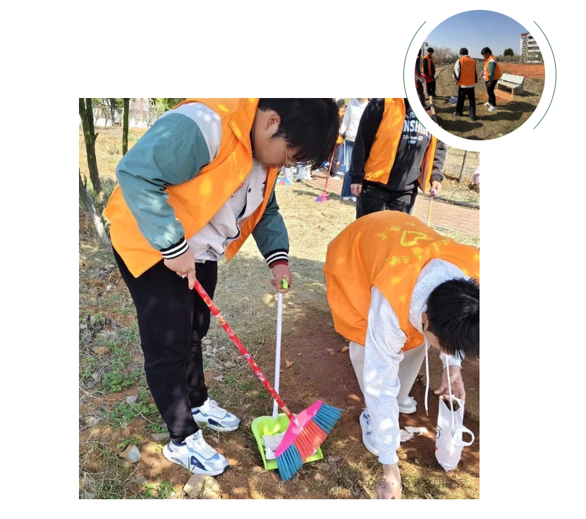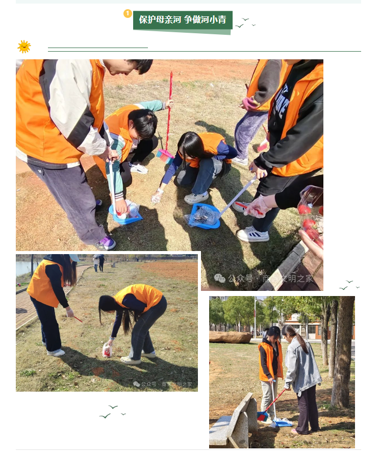 活动期间,志愿者们手持扫把,簸箕等工具,对校园人工湖内河流沿岸进行垃圾清理、河道巡查,重点清理塑料垃圾、废弃物等,保护水资源环境。