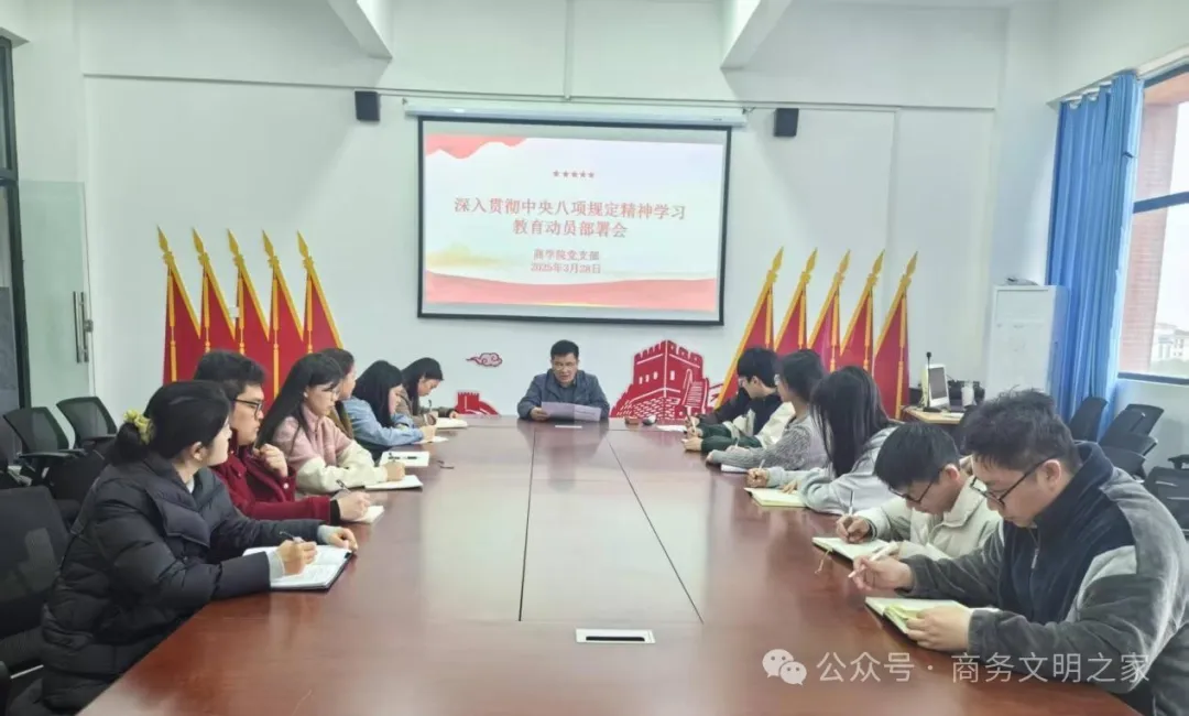 为深入贯彻落实党的二十届三中全会精神和习近平总书记考察江西重要讲话精神,巩固拓展学习贯彻习近平新时中国特色社会主义思想主题教育成果,巩固深化党纪学习教育成果,锲而不舍落实中央八项规定精神,推进作风建设常态化长效化,根据中共江西省委办公厅印发《关于在全省开展深入贯彻中央八项规定精神学习教育的工作方案》、省委教育工委《关于深入贯彻中央八项规定精神学习教育有关工作的提示》精神和学校工作安排部署。3月28日上午10点在新实训楼4-3党员活动室,商学院党支部开展深入贯彻中央八项规定精神学习教育动员部署会。学院全体教职工参与,会议由党支部书记杨旭华主持。