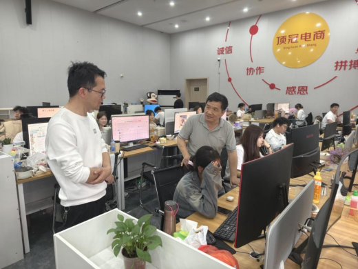 随后在公司领导的陪同下,杨旭华一行实地参观考察了2个女鞋产品营销现场,办公环境、电商运营中心等区域,了解了女鞋的生产,制作,仓储,电商营销,物流配送的全流程,感受到电商行业蓬勃的发展活力,对电商供应链有了更直观的认识。在电商运营中心现场,杨旭华一行还详细了解了业务人员的网络电商营销女鞋产品的操作流程,详细了解他们的底薪,业务提成,五险一金和吃住等情况。