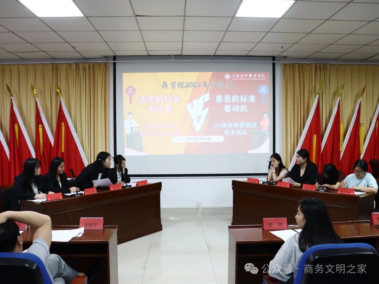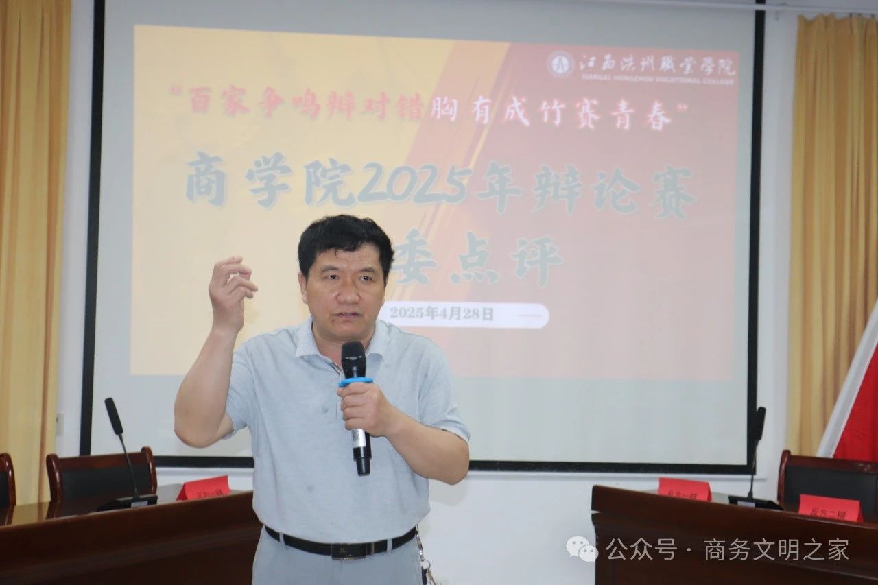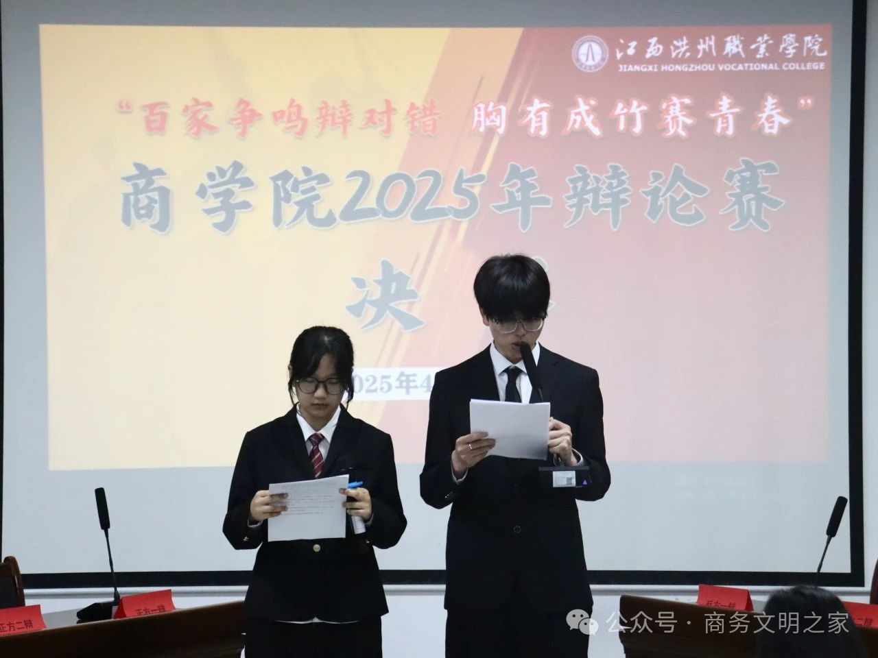 为全面学习贯彻习近平新时代中国特色社会主义思想,深入学习贯彻党的二十大和二十届二中、三中全会精神,培养学生思辨能力,展现新时代广大青年学子的精神风貌,商学院2025年辩论赛总决赛于4月28日晚上七点在图书馆一楼学术报告厅进行,到场评委有党支部书记杨旭华、学工办副主任李婷、辅导员邓建业、李鸽,本次总决赛由付玉婷和钟金菁担任主持。