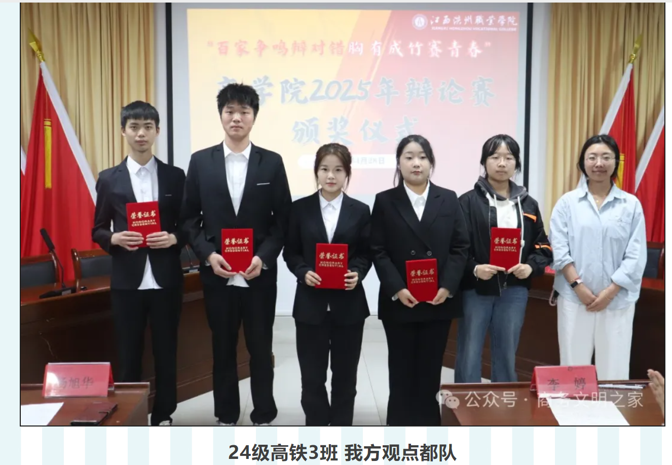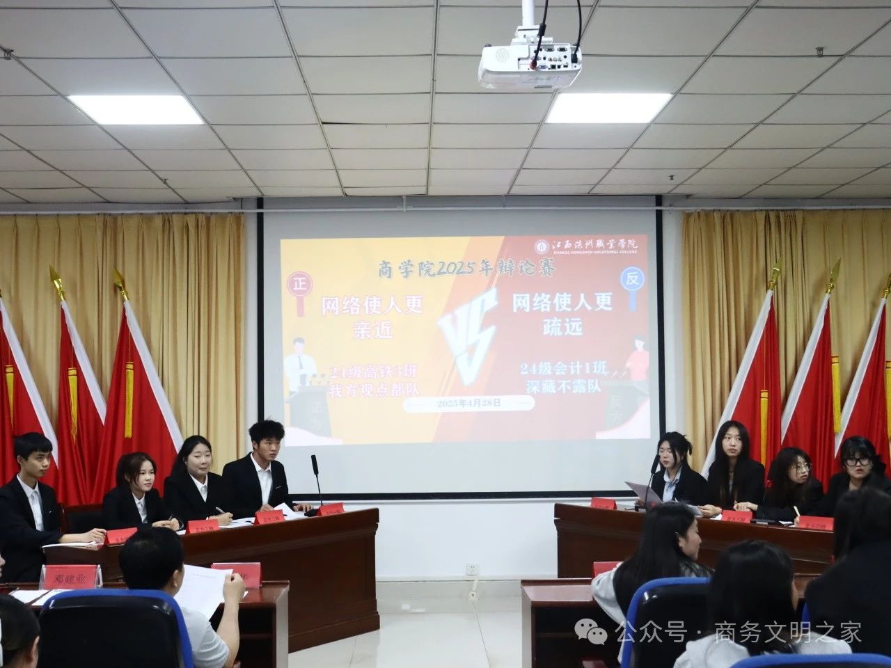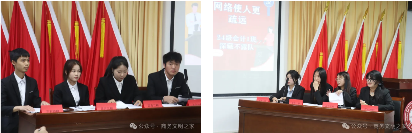 首先进行的是季军争夺战,正反方围绕“网络使人更亲近还是疏远”这一辩题展开了激烈的辩论。正方是来自24级高铁3班的“我方观点都队”,队员分别为赖润祯、唐彬彬、胡国伟、赵佳隆、吴余,观点为网络使人更亲近;反方是来自24级会计1班的“深藏不露队”,队员分别为李乐音、吴怡玲、胡贝贝、蔡梦茹、罗嘉怡,观点为网络使人更疏远。