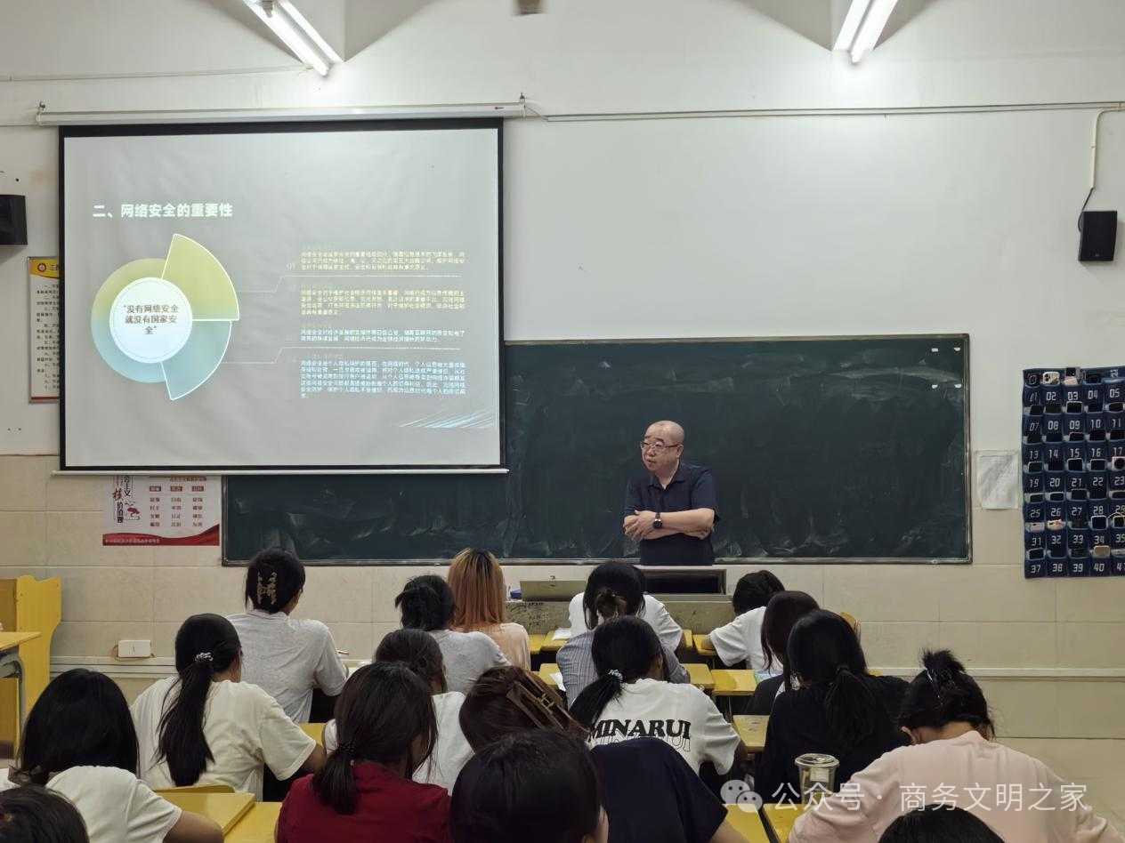 为深入贯彻习近平总书记关于网络强国的重要思想,提升青年学生网络安全意识与防护能力,5月19日晚7点在4栋303,校长助理黎洵以《没有网络安全就没有国家安全》为题,给2024级大数据与会计3班学生们带来了一堂兼具理论深度的网络安全课。