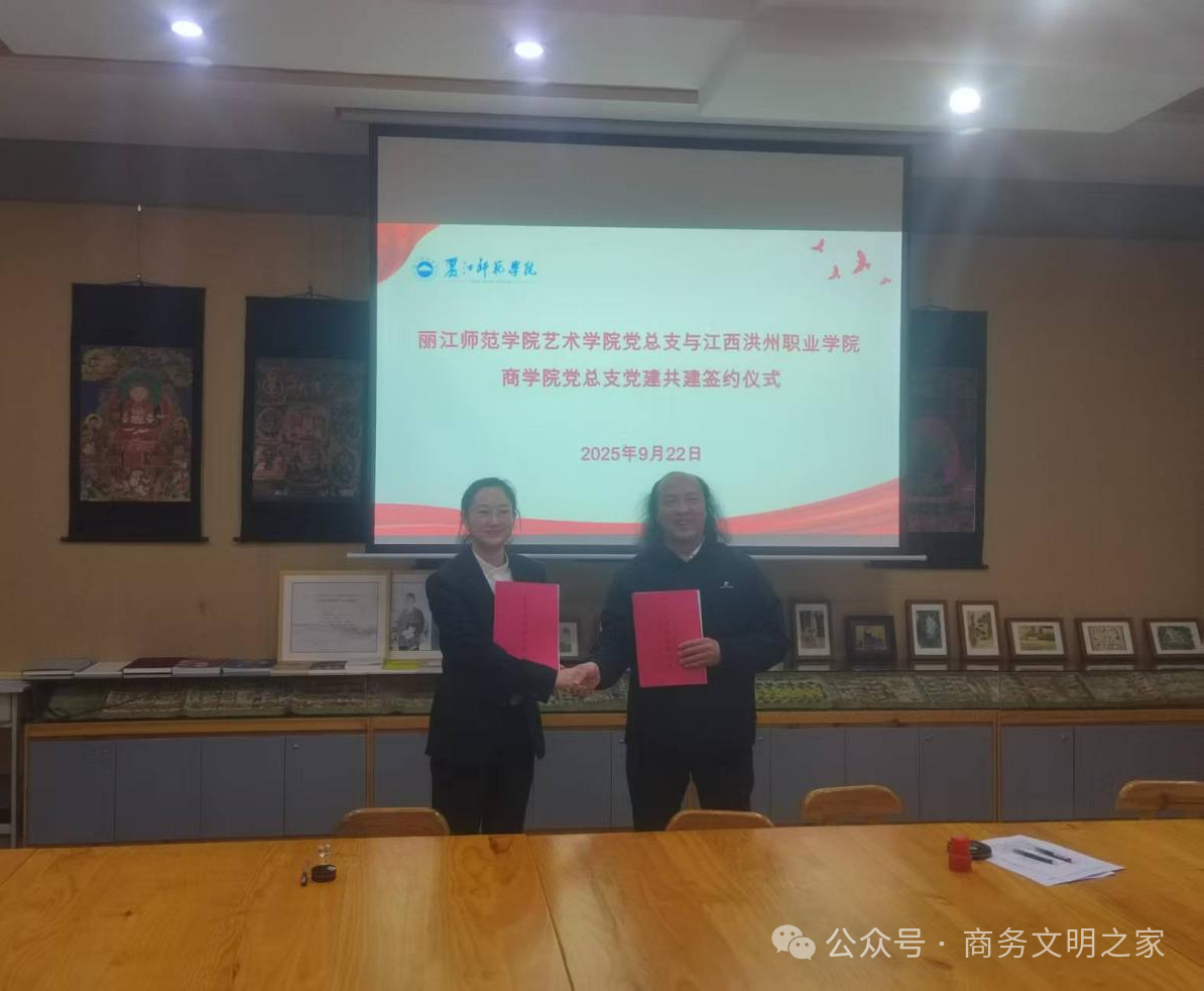 在热烈的掌声中,江西洪州职业学院商学院党总支书记与丽江师范学院艺术学院党总支书记共同签署了结对共建协议,标志着两院党组织之间的合作开启了新篇章。