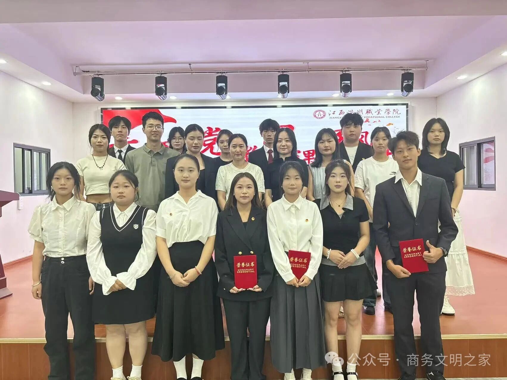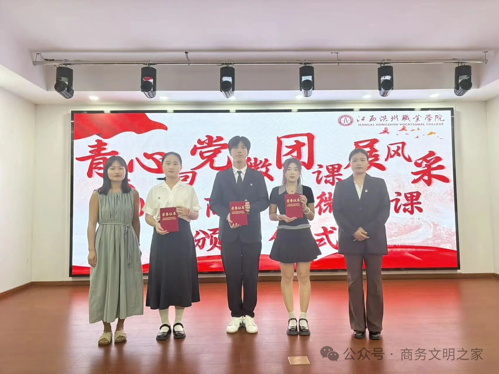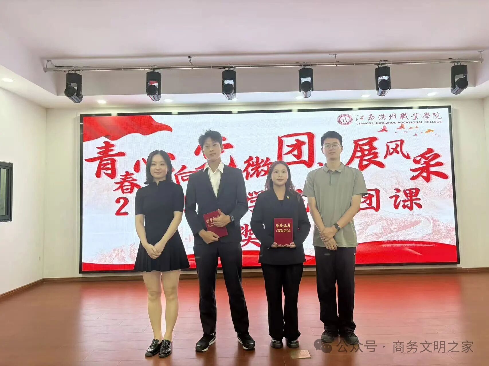 团总支书记李婷、辅导员黄灿兰、邓建业、范恩妮、游佳丽为获奖选手颁发荣誉证书并合影留念。